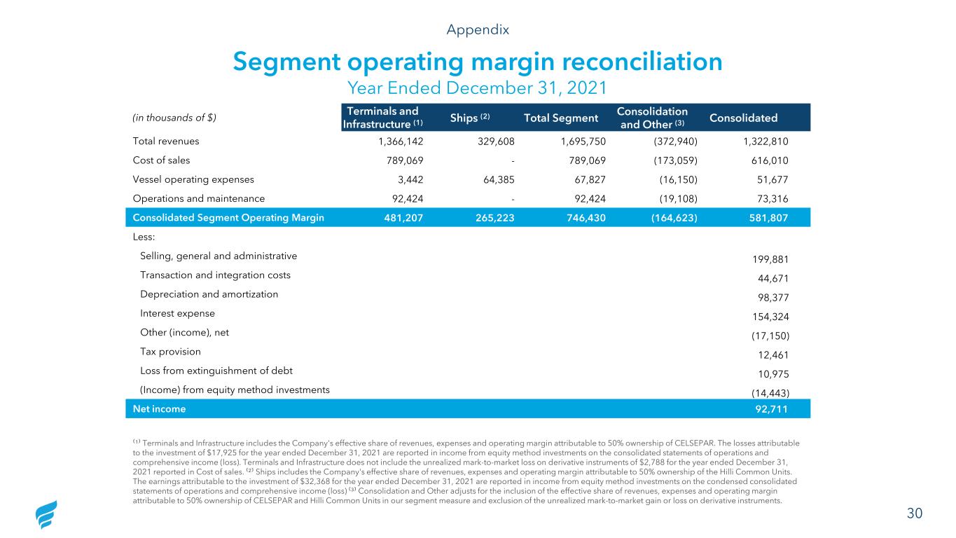 Appendix Segment operating margin reconciliation 31 Year Ended December 31, 2022 (in thousands of $) Terminals and Infrastructure (1) Ships (2) Total Segment Consolidation and Other (3) Consolidated Total revenues 2,168,565 444,616 2,613,181 (244,909) 2,368,272 Cost of sales 1,142,374 — 1,142,374 (131,946) 1,010,428 Vessel operating expenses — 90,544 90,544 (27,026) 63,518 Operations and maintenance 129,970 — 129,970 (24,170) 105,800 Consolidated Segment Operating Margin 896,221 354,072 1,250,293 (61,767) 1,188,526 Less: Selling, general and administrative 236,051 Transaction and integration costs 21,796 Depreciation and amortization 142,640 Asset impairment expense 50,659 Interest expense 236,861 Other (income), net (48,044) Loss from extinguishment of debt, net 14,997 Loss from equity method investments 472,219 Tax (benefit) (123,439) Net income 184,786 ⁽¹⁾ Prior to the completion of the Sergipe Sale, Terminals and Infrastructure included the Company's effective share of revenues, expenses and operating margin attributable to 50% ownership of CELSEPAR. The loss attributable to the investment of $397,874 for the year ended December 31, 2022 are reported in (Loss) income from equity method investments on the consolidated statements of operations and comprehensive income (loss). Terminals and Infrastructure does not include the unrealized mark-to-market loss on derivative instruments of $106,103 for the year ended December 31, 2022 reported in Cost of sales. ⁽²⁾ Ships includes the Company's effective share of revenues, expenses and operating margin attributable to 50% ownership of the Hilli Common Units. The earnings attributable to the investment of $77,132 for the year ended December 31, 2022 are reported in (Loss) income from equity method investments on the consolidated statements of operations and comprehensive income (loss). ⁽³⁾ Consolidation and Other adjusts for the inclusion of the effective share of revenues, expenses and operating margin attributable to 50% ownership of CELSEPAR and Hilli Common Units in our segment measure and exclusion of the unrealized mark-to-market gain or loss on derivative instruments.