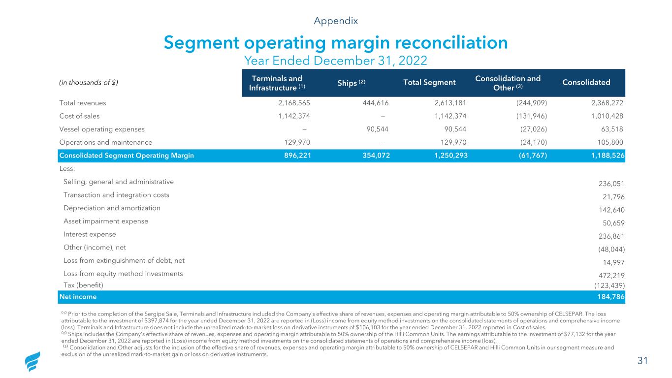 Segment operating margin reconciliation 30 Appendix (in thousands of $) Terminals and Infrastructure (1) Ships (2) Total Segment Consolidation and Other (3) Consolidated Total revenues 1,366,142 329,608 1,695,750 (372,940) 1,322,810 Cost of sales 789,069 - 789,069 (173,059) 616,010 Vessel operating expenses 3,442 64,385 67,827 (16,150) 51,677 Operations and maintenance 92,424 - 92,424 (19,108) 73,316 Consolidated Segment Operating Margin 481,207 265,223 746,430 (164,623) 581,807 Less: Selling, general and administrative 199,881 Transaction and integration costs 44,671 Depreciation and amortization 98,377 Interest expense 154,324 Other (income), net (17,150) Tax provision 12,461 Loss from extinguishment of debt 10,975 (Income) from equity method investments (14,443) Net income 92,711 Year Ended December 31, 2021 ⁽¹⁾ Terminals and Infrastructure includes the Company's effective share of revenues, expenses and operating margin attributable to 50% ownership of CELSEPAR. The losses attributable to the investment of $17,925 for the year ended December 31, 2021 are reported in income from equity method investments on the consolidated statements of operations and comprehensive income (loss). Terminals and Infrastructure does not include the unrealized mark-to-market loss on derivative instruments of $2,788 for the year ended December 31, 2021 reported in Cost of sales. ⁽²⁾ Ships includes the Company's effective share of revenues, expenses and operating margin attributable to 50% ownership of the Hilli Common Units. The earnings attributable to the investment of $32,368 for the year ended December 31, 2021 are reported in income from equity method investments on the condensed consolidated statements of operations and comprehensive income (loss) ⁽³⁾ Consolidation and Other adjusts for the inclusion of the effective share of revenues, expenses and operating margin attributable to 50% ownership of CELSEPAR and Hilli Common Units in our segment measure and exclusion of the unrealized mark-to-market gain or loss on derivative instruments.