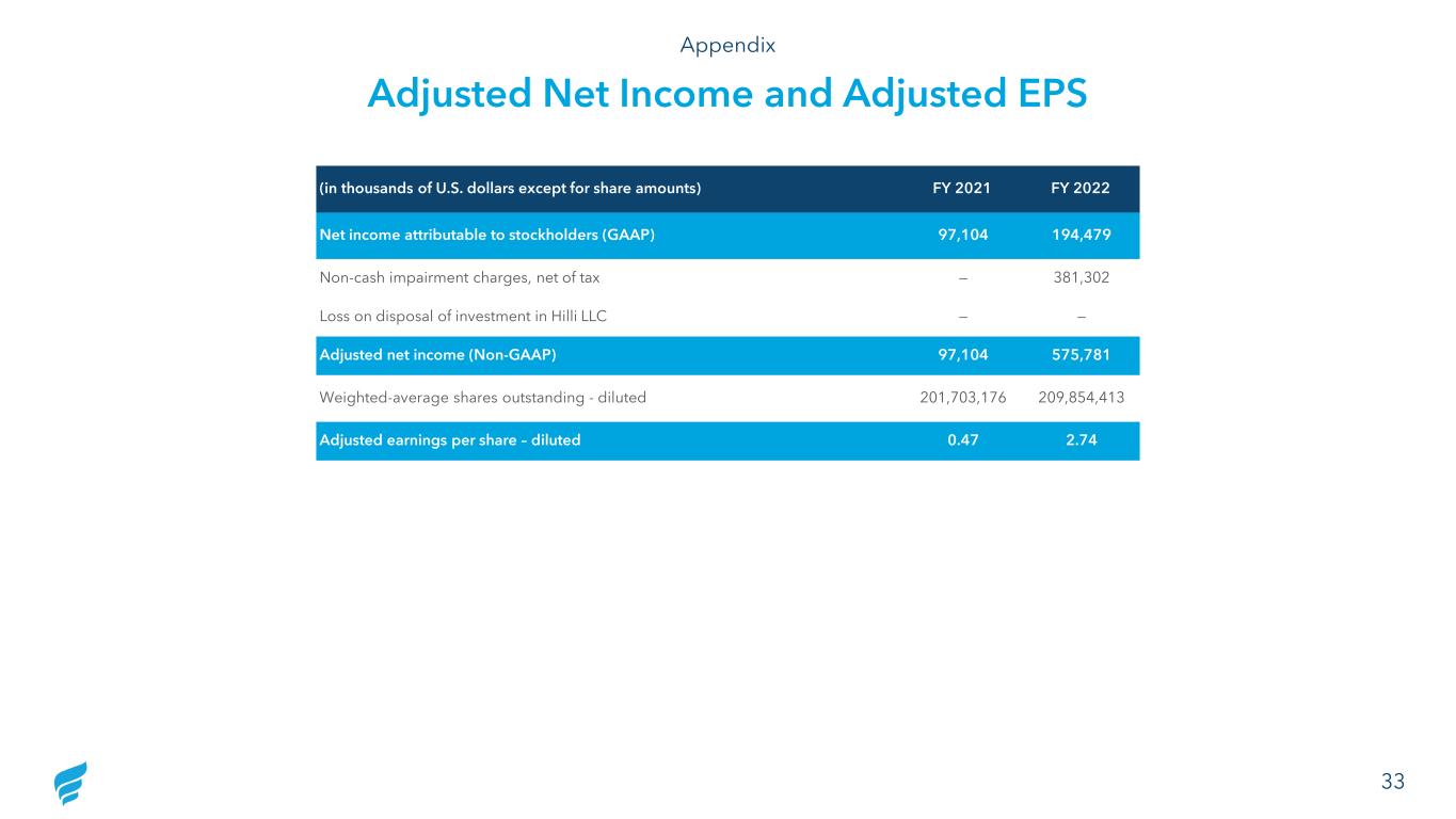 Free cash flow reconciliation 32 Appendix (in thousands of U.S. dollars) FY 2021 FY 2022 Net (loss) income attributable to stockholders 97,104 194,479 Depreciation and amortization 98,377 142,640 Free cash flow (Non-GAAP) 195,481 337,119