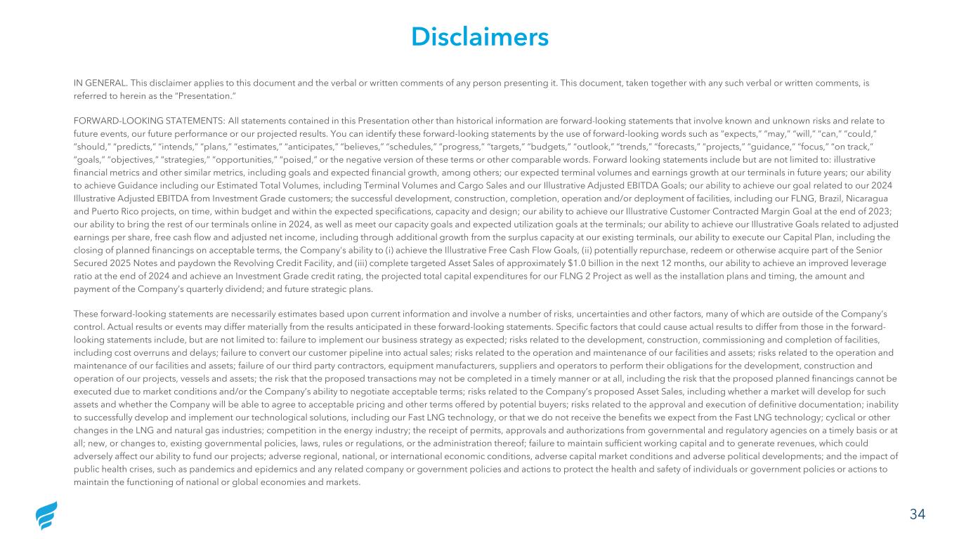 34 Disclaimers IN GENERAL. This disclaimer applies to this document and the verbal or written comments of any person presenting it. This document, taken together with any such verbal or written comments, is referred to herein as the “Presentation.” FORWARD-LOOKING STATEMENTS: All statements contained in this Presentation other than historical information are forward-looking statements that involve known and unknown risks and relate to future events, our future performance or our projected results. You can identify these forward-looking statements by the use of forward-looking words such as “expects,” “may,” “will,” “can,” “could,” “should,” “predicts,” “intends,” “plans,” “estimates,” “anticipates,” “believes,” “schedules,” “progress,” “targets,” “budgets,” “outlook,” “trends,” “forecasts,” “projects,” “guidance,” “focus,” “on track,” “goals,” “objectives,” “strategies,” “opportunities,” “poised,” or the negative version of these terms or other comparable words. Forward looking statements include but are not limited to: illustrative financial metrics and other similar metrics, including goals and expected financial growth, among others; our expected terminal volumes and earnings growth at our terminals in future years; our ability to achieve Guidance including our Estimated Total Volumes, including Terminal Volumes and Cargo Sales and our Illustrative Adjusted EBITDA Goals; our ability to achieve our goal related to our 2024 Illustrative Adjusted EBITDA from Investment Grade customers; the successful development, construction, completion, operation and/or deployment of facilities, including our FLNG, Brazil, Nicaragua and Puerto Rico projects, on time, within budget and within the expected specifications, capacity and design; our ability to achieve our Illustrative Customer Contracted Margin Goal at the end of 2023; our ability to bring the rest of our terminals online in 2024, as well as meet our capacity goals and expected utilization goals at the terminals; our ability to achieve our Illustrative Goals related to adjusted earnings per share, free cash flow and adjusted net income, including through additional growth from the surplus capacity at our existing terminals, our ability to execute our Capital Plan, including the closing of planned financings on acceptable terms, the Company’s ability to (i) achieve the Illustrative Free Cash Flow Goals, (ii) potentially repurchase, redeem or otherwise acquire part of the Senior Secured 2025 Notes and paydown the Revolving Credit Facility, and (iii) complete targeted Asset Sales of approximately $1.0 billion in the next 12 months, our ability to achieve an improved leverage ratio at the end of 2024 and achieve an Investment Grade credit rating, the projected total capital expenditures for our FLNG 2 Project as well as the installation plans and timing, the amount and payment of the Company’s quarterly dividend; and future strategic plans. These forward-looking statements are necessarily estimates based upon current information and involve a number of risks, uncertainties and other factors, many of which are outside of the Company’s control. Actual results or events may differ materially from the results anticipated in these forward-looking statements. Specific factors that could cause actual results to differ from those in the forward- looking statements include, but are not limited to: failure to implement our business strategy as expected; risks related to the development, construction, commissioning and completion of facilities, including cost overruns and delays; failure to convert our customer pipeline into actual sales; risks related to the operation and maintenance of our facilities and assets; risks related to the operation and maintenance of our facilities and assets; failure of our third party contractors, equipment manufacturers, suppliers and operators to perform their obligations for the development, construction and operation of our projects, vessels and assets; the risk that the proposed transactions may not be completed in a timely manner or at all, including the risk that the proposed planned financings cannot be executed due to market conditions and/or the Company’s ability to negotiate acceptable terms; risks related to the Company’s proposed Asset Sales, including whether a market will develop for such assets and whether the Company will be able to agree to acceptable pricing and other terms offered by potential buyers; risks related to the approval and execution of definitive documentation; inability to successfully develop and implement our technological solutions, including our Fast LNG technology, or that we do not receive the benefits we expect from the Fast LNG technology; cyclical or other changes in the LNG and natural gas industries; competition in the energy industry; the receipt of permits, approvals and authorizations from governmental and regulatory agencies on a timely basis or at all; new, or changes to, existing governmental policies, laws, rules or regulations, or the administration thereof; failure to maintain sufficient working capital and to generate revenues, which could adversely affect our ability to fund our projects; adverse regional, national, or international economic conditions, adverse capital market conditions and adverse political developments; and the impact of public health crises, such as pandemics and epidemics and any related company or government policies and actions to protect the health and safety of individuals or government policies or actions to maintain the functioning of national or global economies and markets.