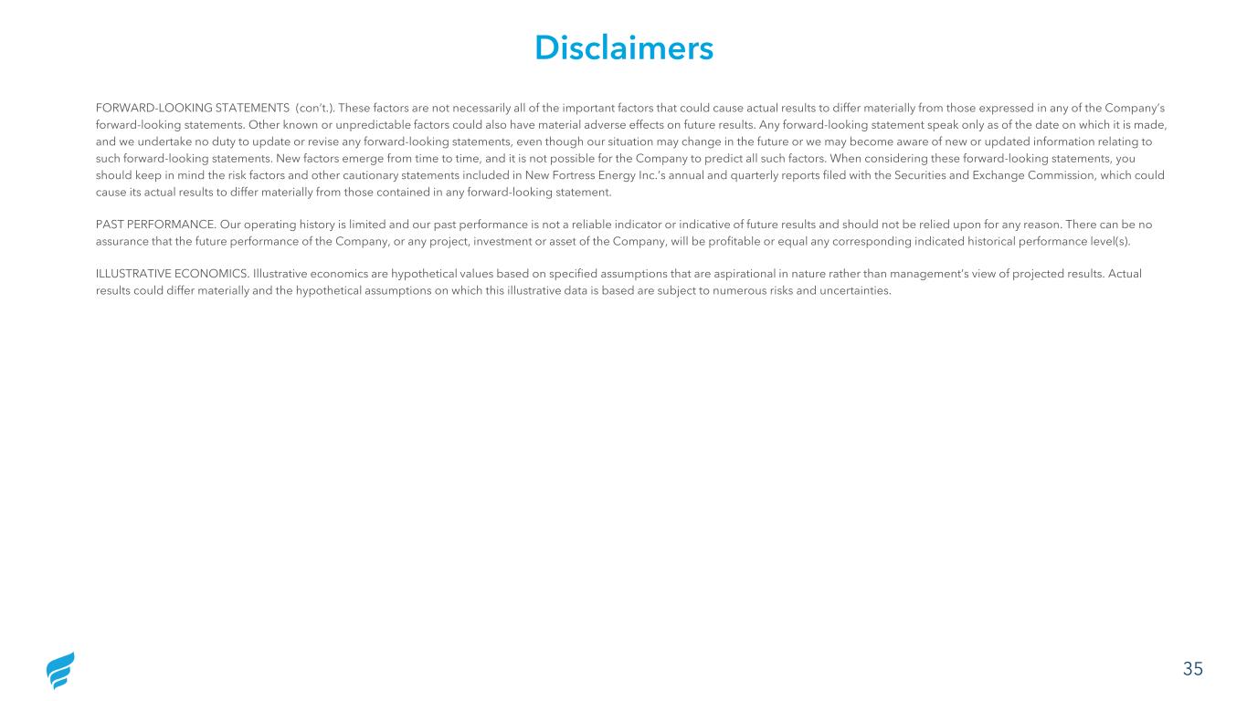 35 Disclaimers FORWARD-LOOKING STATEMENTS (con’t.). These factors are not necessarily all of the important factors that could cause actual results to differ materially from those expressed in any of the Company’s forward-looking statements. Other known or unpredictable factors could also have material adverse effects on future results. Any forward-looking statement speak only as of the date on which it is made, and we undertake no duty to update or revise any forward-looking statements, even though our situation may change in the future or we may become aware of new or updated information relating to such forward-looking statements. New factors emerge from time to time, and it is not possible for the Company to predict all such factors. When considering these forward-looking statements, you should keep in mind the risk factors and other cautionary statements included in New Fortress Energy Inc.’s annual and quarterly reports filed with the Securities and Exchange Commission, which could cause its actual results to differ materially from those contained in any forward-looking statement. PAST PERFORMANCE. Our operating history is limited and our past performance is not a reliable indicator or indicative of future results and should not be relied upon for any reason. There can be no assurance that the future performance of the Company, or any project, investment or asset of the Company, will be profitable or equal any corresponding indicated historical performance level(s). ILLUSTRATIVE ECONOMICS. Illustrative economics are hypothetical values based on specified assumptions that are aspirational in nature rather than management’s view of projected results. Actual results could differ materially and the hypothetical assumptions on which this illustrative data is based are subject to numerous risks and uncertainties.