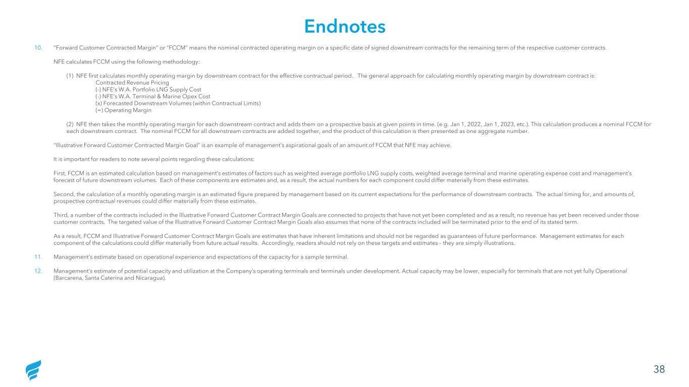 Endnotes 38 10. “Forward Customer Contracted Margin” or “FCCM” means the nominal contracted operating margin on a specific date of signed downstream contracts for the remaining term of the respective customer contracts. NFE calculates FCCM using the following methodology: (1) NFE first calculates monthly operating margin by downstream contract for the effective contractual period. The general approach for calculating monthly operating margin by downstream contract is: Contracted Revenue Pricing (-) NFE’s W.A. Portfolio LNG Supply Cost (-) NFE’s W.A. Terminal & Marine Opex Cost (x) Forecasted Downstream Volumes (within Contractual Limits) (=) Operating Margin (2) NFE then takes the monthly operating margin for each downstream contract and adds them on a prospective basis at given points in time. (e.g. Jan 1, 2022, Jan 1, 2023, etc.). This calculation produces a nominal FCCM for each downstream contract. The nominal FCCM for all downstream contracts are added together, and the product of this calculation is then presented as one aggregate number. “Illustrative Forward Customer Contracted Margin Goal” is an example of management’s aspirational goals of an amount of FCCM that NFE may achieve. It is important for readers to note several points regarding these calculations: First, FCCM is an estimated calculation based on management’s estimates of factors such as weighted average portfolio LNG supply costs, weighted average terminal and marine operating expense cost and management’s forecast of future downstream volumes. Each of these components are estimates and, as a result, the actual numbers for each component could differ materially from these estimates. Second, the calculation of a monthly operating margin is an estimated figure prepared by management based on its current expectations for the performance of downstream contracts. The actual timing for, and amounts of, prospective contractual revenues could differ materially from these estimates. Third, a number of the contracts included in the Illustrative Forward Customer Contract Margin Goals are connected to projects that have not yet been completed and as a result, no revenue has yet been received under those customer contracts. The targeted value of the Illustrative Forward Customer Contract Margin Goals also assumes that none of the contracts included will be terminated prior to the end of its stated term. As a result, FCCM and Illustrative Forward Customer Contract Margin Goals are estimates that have inherent limitations and should not be regarded as guarantees of future performance. Management estimates for each component of the calculations could differ materially from future actual results. Accordingly, readers should not rely on these targets and estimates – they are simply illustrations. 11. Management’s estimate based on operational experience and expectations of the capacity for a sample terminal. 12. Management’s estimate of potential capacity and utilization at the Company’s operating terminals and terminals under development. Actual capacity may be lower, especially for terminals that are not yet fully Operational (Barcarena, Santa Caterina and Nicaragua).