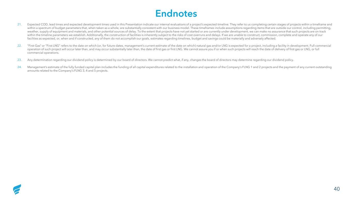 Endnotes 40 21. Expected COD, lead times and expected development times used in this Presentation indicate our internal evaluations of a project’s expected timeline. They refer to us completing certain stages of projects within a timeframe and within a spectrum of budget parameters that, when taken as a whole, are substantially consistent with our business model. These timeframes include assumptions regarding items that are outside our control, including permitting, weather, supply of equipment and materials, and other potential sources of delay. To the extent that projects have not yet started or are currently under development, we can make no assurance that such projects are on track within the timeline parameters we establish. Additionally, the construction of facilities is inherently subject to the risks of cost overruns and delays. If we are unable to construct, commission, complete and operate any of our facilities as expected, or, when and if constructed, any of them do not accomplish our goals, estimates regarding timelines, budget and savings could be materially and adversely affected. 22. “First Gas” or “First LNG” refers to the date on which (or, for future dates, management's current estimate of the date on which) natural gas and/or LNG is expected for a project, including a facility in development. Full commercial operation of such project will occur later than, and may occur substantially later than, the date of first gas or first LNG. We cannot assure you if or when such projects will reach the date of delivery of first gas or LNG, or full commercial operations. 23. Any determination regarding our dividend policy is determined by our board of directors. We cannot predict what, if any, changes the board of directors may determine regarding our dividend policy. 24. Management’s estimate of the fully funded capital plan includes the funding of all capital expenditures related to the installation and operation of the Company’s FLNG 1 and 2 projects and the payment of any current outstanding amounts related to the Company’s FLNG 3, 4 and 5 projects.