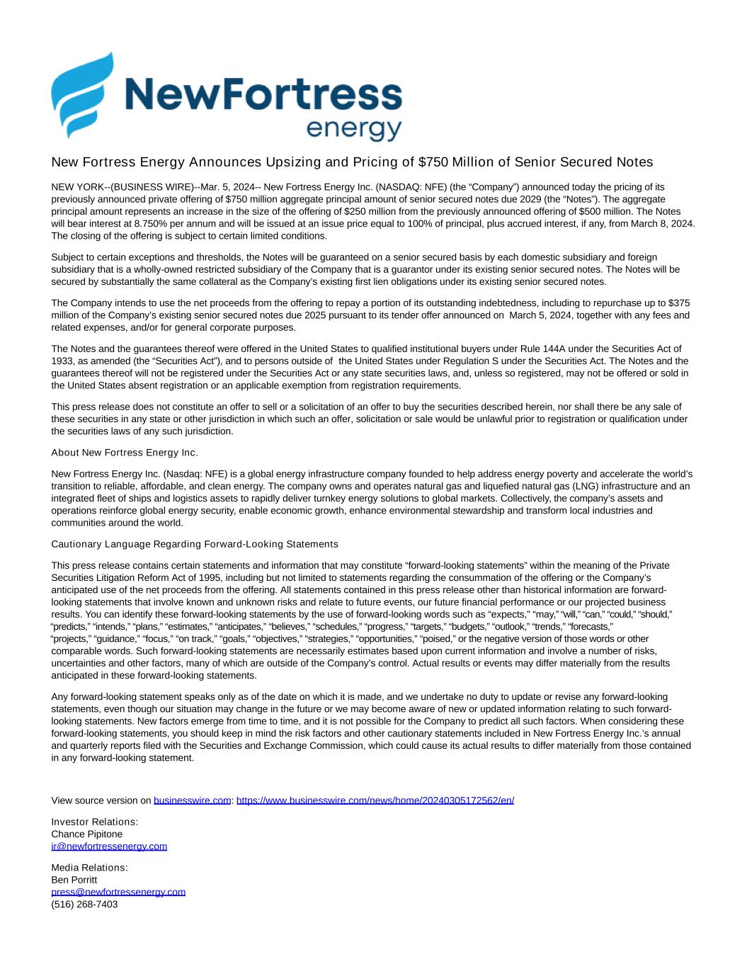 New Fortress Energy Announces Upsizing and Pricing of $750 Million of Senior Secured Notes NEW YORK--(BUSINESS WIRE)--Mar. 5, 2024-- New Fortress Energy Inc. (NASDAQ: NFE) (the “Company”) announced today the pricing of its previously announced private offering of $750 million aggregate principal amount of senior secured notes due 2029 (the “Notes”). The aggregate principal amount represents an increase in the size of the offering of $250 million from the previously announced offering of $500 million. The Notes will bear interest at 8.750% per annum and will be issued at an issue price equal to 100% of principal, plus accrued interest, if any, from March 8, 2024. The closing of the offering is subject to certain limited conditions. Subject to certain exceptions and thresholds, the Notes will be guaranteed on a senior secured basis by each domestic subsidiary and foreign subsidiary that is a wholly-owned restricted subsidiary of the Company that is a guarantor under its existing senior secured notes. The Notes will be secured by substantially the same collateral as the Company’s existing first lien obligations under its existing senior secured notes. The Company intends to use the net proceeds from the offering to repay a portion of its outstanding indebtedness, including to repurchase up to $375 million of the Company’s existing senior secured notes due 2025 pursuant to its tender offer announced on March 5, 2024, together with any fees and related expenses, and/or for general corporate purposes. The Notes and the guarantees thereof were offered in the United States to qualified institutional buyers under Rule 144A under the Securities Act of 1933, as amended (the “Securities Act”), and to persons outside of the United States under Regulation S under the Securities Act. The Notes and the guarantees thereof will not be registered under the Securities Act or any state securities laws, and, unless so registered, may not be offered or sold in the United States absent registration or an applicable exemption from registration requirements. This press release does not constitute an offer to sell or a solicitation of an offer to buy the securities described herein, nor shall there be any sale of these securities in any state or other jurisdiction in which such an offer, solicitation or sale would be unlawful prior to registration or qualification under the securities laws of any such jurisdiction. About New Fortress Energy Inc. New Fortress Energy Inc. (Nasdaq: NFE) is a global energy infrastructure company founded to help address energy poverty and accelerate the world’s transition to reliable, affordable, and clean energy. The company owns and operates natural gas and liquefied natural gas (LNG) infrastructure and an integrated fleet of ships and logistics assets to rapidly deliver turnkey energy solutions to global markets. Collectively, the company’s assets and operations reinforce global energy security, enable economic growth, enhance environmental stewardship and transform local industries and communities around the world. Cautionary Language Regarding Forward-Looking Statements This press release contains certain statements and information that may constitute “forward-looking statements” within the meaning of the Private Securities Litigation Reform Act of 1995, including but not limited to statements regarding the consummation of the offering or the Company’s anticipated use of the net proceeds from the offering. All statements contained in this press release other than historical information are forward- looking statements that involve known and unknown risks and relate to future events, our future financial performance or our projected business results. You can identify these forward-looking statements by the use of forward-looking words such as “expects,” “may,” “will,” “can,” “could,” “should,” “predicts,” “intends,” “plans,” “estimates,” “anticipates,” “believes,” “schedules,” “progress,” “targets,” “budgets,” “outlook,” “trends,” “forecasts,” “projects,” “guidance,” “focus,” “on track,” “goals,” “objectives,” “strategies,” “opportunities,” “poised,” or the negative version of those words or other comparable words. Such forward-looking statements are necessarily estimates based upon current information and involve a number of risks, uncertainties and other factors, many of which are outside of the Company’s control. Actual results or events may differ materially from the results anticipated in these forward-looking statements. Any forward-looking statement speaks only as of the date on which it is made, and we undertake no duty to update or revise any forward-looking statements, even though our situation may change in the future or we may become aware of new or updated information relating to such forward- looking statements. New factors emerge from time to time, and it is not possible for the Company to predict all such factors. When considering these forward-looking statements, you should keep in mind the risk factors and other cautionary statements included in New Fortress Energy Inc.’s annual and quarterly reports filed with the Securities and Exchange Commission, which could cause its actual results to differ materially from those contained in any forward-looking statement. View source version on businesswire.com: https://www.businesswire.com/news/home/20240305172562/en/ Investor Relations: Chance Pipitone ir@newfortressenergy.com Media Relations: Ben Porritt press@newfortressenergy.com (516) 268-7403