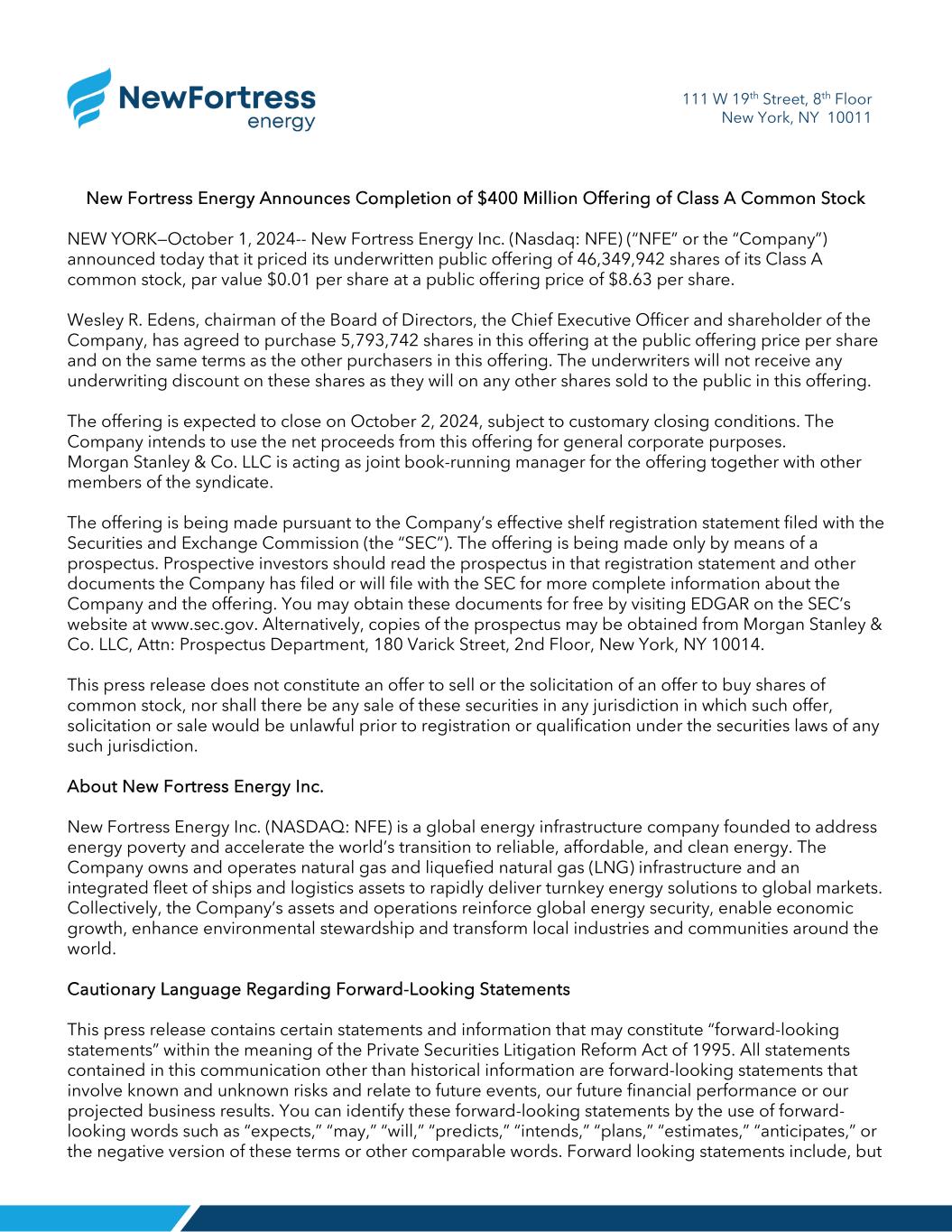 New Fortress Energy Announces Completion of $400 Million Offering of Class A Common Stock NEW YORK—October 1, 2024-- New Fortress Energy Inc. (Nasdaq: NFE) (“NFE” or the “Company”) announced today that it priced its underwritten public offering of 46,349,942 shares of its Class A common stock, par value $0.01 per share at a public offering price of $8.63 per share. Wesley R. Edens, chairman of the Board of Directors, the Chief Executive Officer and shareholder of the Company, has agreed to purchase 5,793,742 shares in this offering at the public offering price per share and on the same terms as the other purchasers in this offering. The underwriters will not receive any underwriting discount on these shares as they will on any other shares sold to the public in this offering. The offering is expected to close on October 2, 2024, subject to customary closing conditions. The Company intends to use the net proceeds from this offering for general corporate purposes. Morgan Stanley & Co. LLC is acting as joint book-running manager for the offering together with other members of the syndicate. The offering is being made pursuant to the Company’s effective shelf registration statement filed with the Securities and Exchange Commission (the “SEC”). The offering is being made only by means of a prospectus. Prospective investors should read the prospectus in that registration statement and other documents the Company has filed or will file with the SEC for more complete information about the Company and the offering. You may obtain these documents for free by visiting EDGAR on the SEC’s website at www.sec.gov. Alternatively, copies of the prospectus may be obtained from Morgan Stanley & Co. LLC, Attn: Prospectus Department, 180 Varick Street, 2nd Floor, New York, NY 10014. This press release does not constitute an offer to sell or the solicitation of an offer to buy shares of common stock, nor shall there be any sale of these securities in any jurisdiction in which such offer, solicitation or sale would be unlawful prior to registration or qualification under the securities laws of any such jurisdiction. About New Fortress Energy Inc. New Fortress Energy Inc. (NASDAQ: NFE) is a global energy infrastructure company founded to address energy poverty and accelerate the world’s transition to reliable, affordable, and clean energy. The Company owns and operates natural gas and liquefied natural gas (LNG) infrastructure and an integrated fleet of ships and logistics assets to rapidly deliver turnkey energy solutions to global markets. Collectively, the Company’s assets and operations reinforce global energy security, enable economic growth, enhance environmental stewardship and transform local industries and communities around the world. Cautionary Language Regarding Forward-Looking Statements This press release contains certain statements and information that may constitute “forward-looking statements” within the meaning of the Private Securities Litigation Reform Act of 1995. All statements contained in this communication other than historical information are forward-looking statements that involve known and unknown risks and relate to future events, our future financial performance or our projected business results. You can identify these forward-looking statements by the use of forward- looking words such as “expects,” “may,” “will,” “predicts,” “intends,” “plans,” “estimates,” “anticipates,” or the negative version of these terms or other comparable words. Forward looking statements include, but 111 W 19th Street, 8th Floor New York, NY 10011