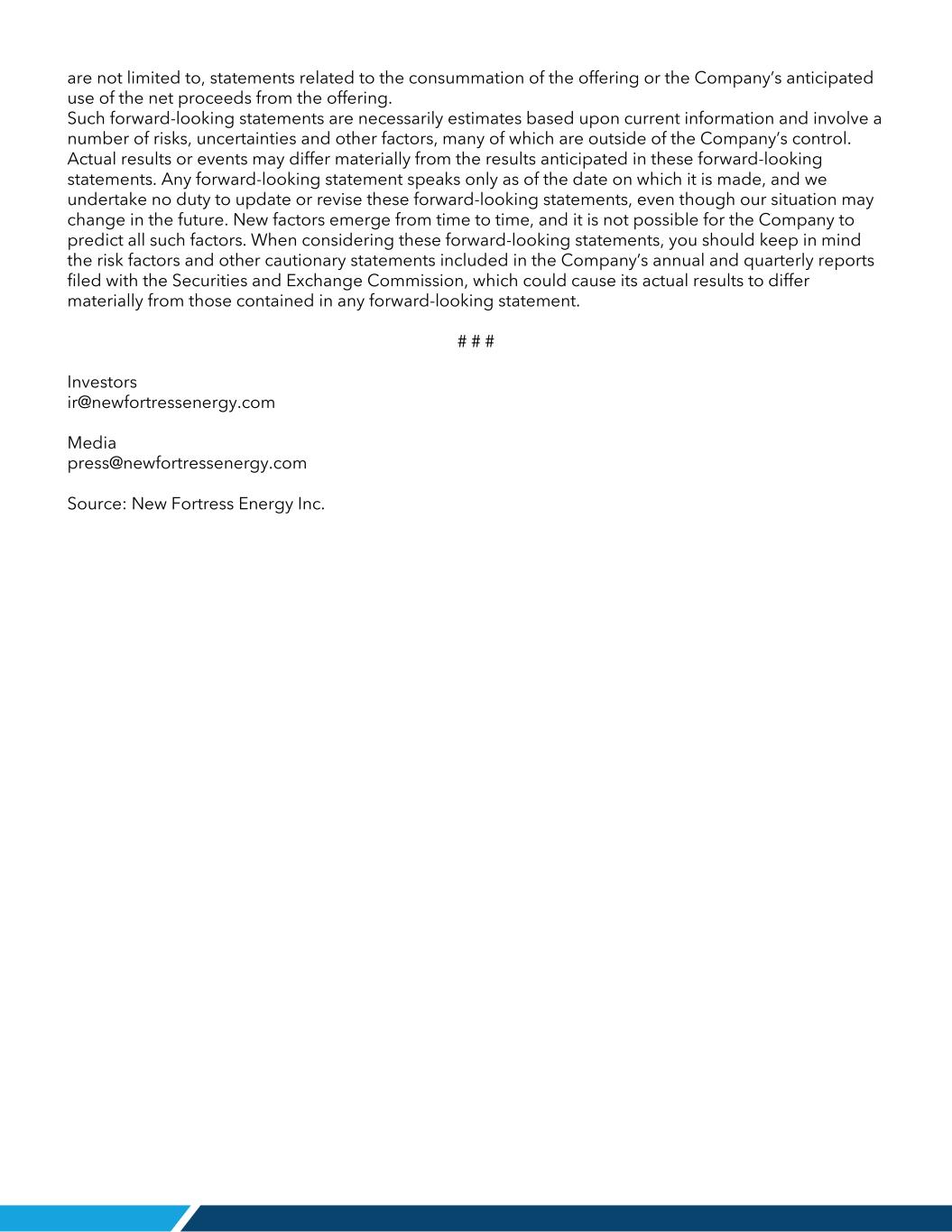 are not limited to, statements related to the consummation of the offering or the Company’s anticipated use of the net proceeds from the offering. Such forward-looking statements are necessarily estimates based upon current information and involve a number of risks, uncertainties and other factors, many of which are outside of the Company’s control. Actual results or events may differ materially from the results anticipated in these forward-looking statements. Any forward-looking statement speaks only as of the date on which it is made, and we undertake no duty to update or revise these forward-looking statements, even though our situation may change in the future. New factors emerge from time to time, and it is not possible for the Company to predict all such factors. When considering these forward-looking statements, you should keep in mind the risk factors and other cautionary statements included in the Company’s annual and quarterly reports filed with the Securities and Exchange Commission, which could cause its actual results to differ materially from those contained in any forward-looking statement. # # # Investors ir@newfortressenergy.com Media press@newfortressenergy.com Source: New Fortress Energy Inc.