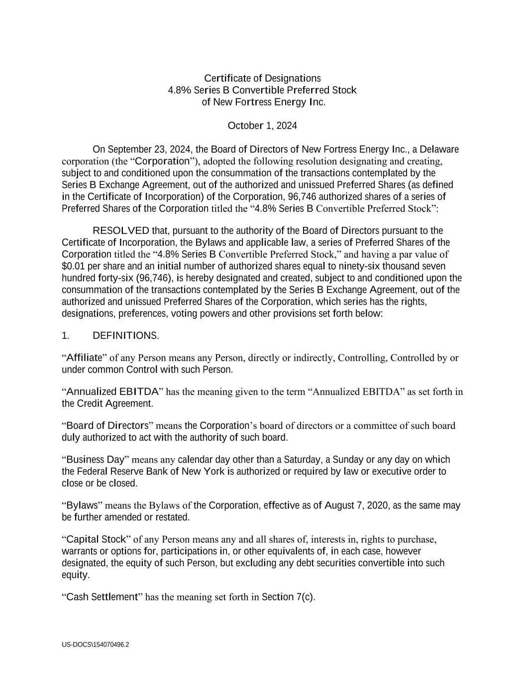 US-DOCS\154070496.2 Certificate of Designations 4.8% Series B Convertible Preferred Stock of New Fortress Energy Inc. October 1, 2024 On September 23, 2024, the Board of Directors of New Fortress Energy Inc., a Delaware corporation (the “Corporation”), adopted the following resolution designating and creating, subject to and conditioned upon the consummation of the transactions contemplated by the Series B Exchange Agreement, out of the authorized and unissued Preferred Shares (as defined in the Certificate of Incorporation) of the Corporation, 96,746 authorized shares of a series of Preferred Shares of the Corporation titled the “4.8% Series B Convertible Preferred Stock”: RESOLVED that, pursuant to the authority of the Board of Directors pursuant to the Certificate of Incorporation, the Bylaws and applicable law, a series of Preferred Shares of the Corporation titled the “4.8% Series B Convertible Preferred Stock,” and having a par value of $0.01 per share and an initial number of authorized shares equal to ninety-six thousand seven hundred forty-six (96,746), is hereby designated and created, subject to and conditioned upon the consummation of the transactions contemplated by the Series B Exchange Agreement, out of the authorized and unissued Preferred Shares of the Corporation, which series has the rights, designations, preferences, voting powers and other provisions set forth below: 1. DEFINITIONS. “Affiliate” of any Person means any Person, directly or indirectly, Controlling, Controlled by or under common Control with such Person. “Annualized EBITDA” has the meaning given to the term “Annualized EBITDA” as set forth in the Credit Agreement. “Board of Directors” means the Corporation’s board of directors or a committee of such board duly authorized to act with the authority of such board. “Business Day” means any calendar day other than a Saturday, a Sunday or any day on which the Federal Reserve Bank of New York is authorized or required by law or executive order to close or be closed. “Bylaws” means the Bylaws of the Corporation, effective as of August 7, 2020, as the same may be further amended or restated. “Capital Stock” of any Person means any and all shares of, interests in, rights to purchase, warrants or options for, participations in, or other equivalents of, in each case, however designated, the equity of such Person, but excluding any debt securities convertible into such equity. “Cash Settlement” has the meaning set forth in Section 7(c).