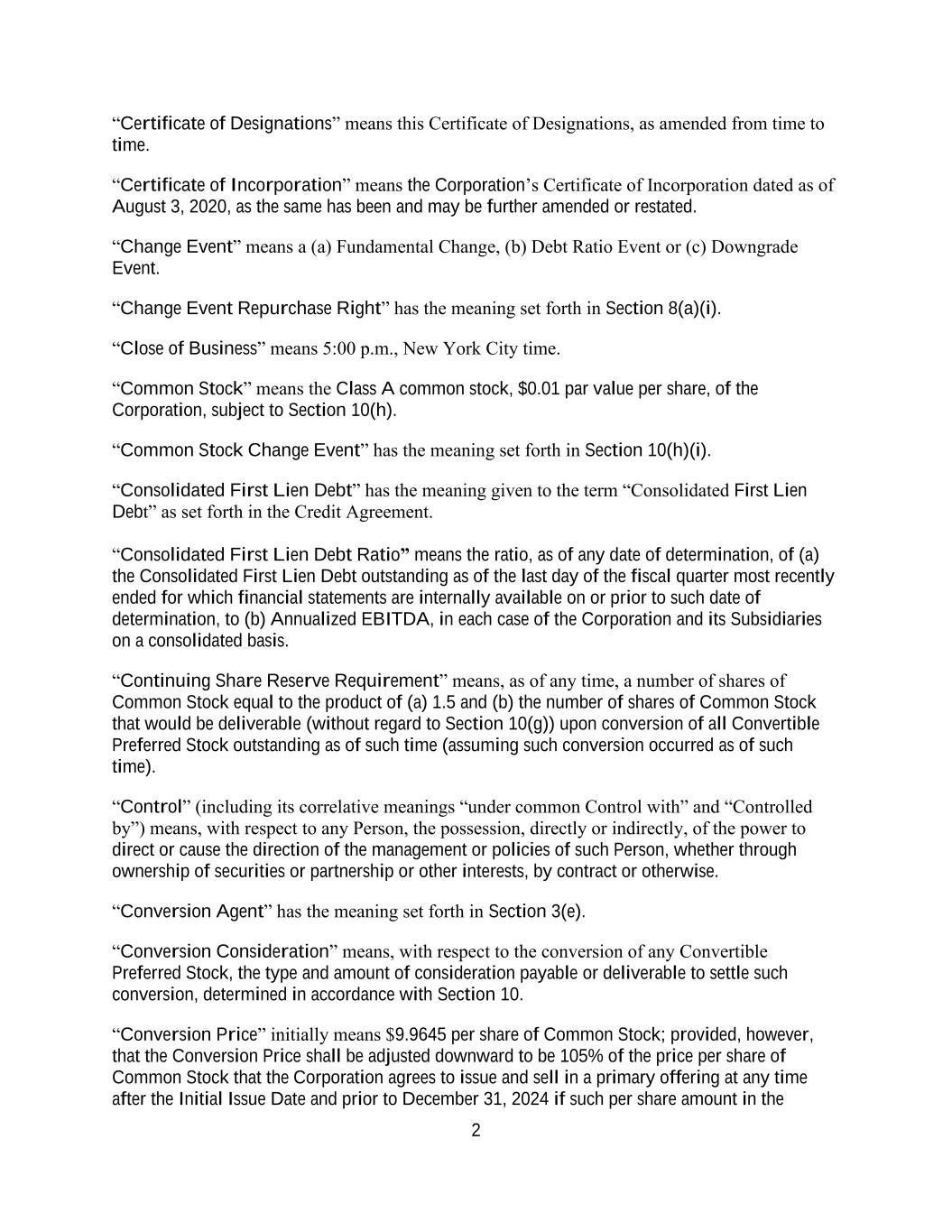 2 “Certificate of Designations” means this Certificate of Designations, as amended from time to time. “Certificate of Incorporation” means the Corporation’s Certificate of Incorporation dated as of August 3, 2020, as the same has been and may be further amended or restated. “Change Event” means a (a) Fundamental Change, (b) Debt Ratio Event or (c) Downgrade Event. “Change Event Repurchase Right” has the meaning set forth in Section 8(a)(i). “Close of Business” means 5:00 p.m., New York City time. “Common Stock” means the Class A common stock, $0.01 par value per share, of the Corporation, subject to Section 10(h). “Common Stock Change Event” has the meaning set forth in Section 10(h)(i). “Consolidated First Lien Debt” has the meaning given to the term “Consolidated First Lien Debt” as set forth in the Credit Agreement. “Consolidated First Lien Debt Ratio” means the ratio, as of any date of determination, of (a) the Consolidated First Lien Debt outstanding as of the last day of the fiscal quarter most recently ended for which financial statements are internally available on or prior to such date of determination, to (b) Annualized EBITDA, in each case of the Corporation and its Subsidiaries on a consolidated basis. “Continuing Share Reserve Requirement” means, as of any time, a number of shares of Common Stock equal to the product of (a) 1.5 and (b) the number of shares of Common Stock that would be deliverable (without regard to Section 10(g)) upon conversion of all Convertible Preferred Stock outstanding as of such time (assuming such conversion occurred as of such time). “Control” (including its correlative meanings “under common Control with” and “Controlled by”) means, with respect to any Person, the possession, directly or indirectly, of the power to direct or cause the direction of the management or policies of such Person, whether through ownership of securities or partnership or other interests, by contract or otherwise. “Conversion Agent” has the meaning set forth in Section 3(e). “Conversion Consideration” means, with respect to the conversion of any Convertible Preferred Stock, the type and amount of consideration payable or deliverable to settle such conversion, determined in accordance with Section 10. “Conversion Price” initially means $9.9645 per share of Common Stock; provided, however, that the Conversion Price shall be adjusted downward to be 105% of the price per share of Common Stock that the Corporation agrees to issue and sell in a primary offering at any time after the Initial Issue Date and prior to December 31, 2024 if such per share amount in the