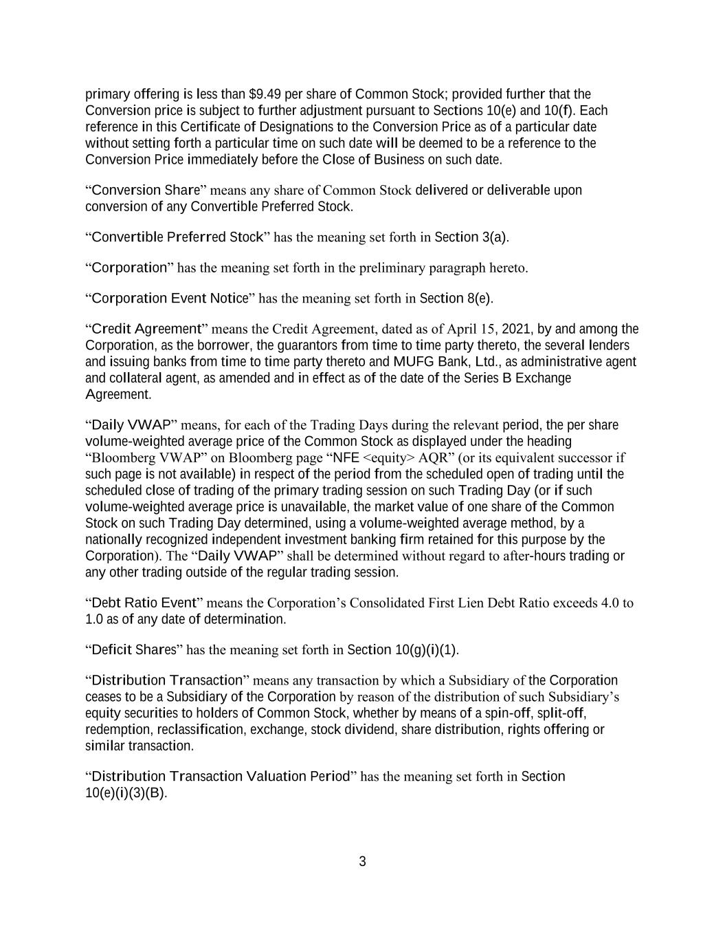 3 primary offering is less than $9.49 per share of Common Stock; provided further that the Conversion price is subject to further adjustment pursuant to Sections 10(e) and 10(f). Each reference in this Certificate of Designations to the Conversion Price as of a particular date without setting forth a particular time on such date will be deemed to be a reference to the Conversion Price immediately before the Close of Business on such date. “Conversion Share” means any share of Common Stock delivered or deliverable upon conversion of any Convertible Preferred Stock. “Convertible Preferred Stock” has the meaning set forth in Section 3(a). “Corporation” has the meaning set forth in the preliminary paragraph hereto. “Corporation Event Notice” has the meaning set forth in Section 8(e). “Credit Agreement” means the Credit Agreement, dated as of April 15, 2021, by and among the Corporation, as the borrower, the guarantors from time to time party thereto, the several lenders and issuing banks from time to time party thereto and MUFG Bank, Ltd., as administrative agent and collateral agent, as amended and in effect as of the date of the Series B Exchange Agreement. “Daily VWAP” means, for each of the Trading Days during the relevant period, the per share volume-weighted average price of the Common Stock as displayed under the heading “Bloomberg VWAP” on Bloomberg page “NFE <equity> AQR” (or its equivalent successor if such page is not available) in respect of the period from the scheduled open of trading until the scheduled close of trading of the primary trading session on such Trading Day (or if such volume-weighted average price is unavailable, the market value of one share of the Common Stock on such Trading Day determined, using a volume-weighted average method, by a nationally recognized independent investment banking firm retained for this purpose by the Corporation). The “Daily VWAP” shall be determined without regard to after-hours trading or any other trading outside of the regular trading session. “Debt Ratio Event” means the Corporation’s Consolidated First Lien Debt Ratio exceeds 4.0 to 1.0 as of any date of determination. “Deficit Shares” has the meaning set forth in Section 10(g)(i)(1). “Distribution Transaction” means any transaction by which a Subsidiary of the Corporation ceases to be a Subsidiary of the Corporation by reason of the distribution of such Subsidiary’s equity securities to holders of Common Stock, whether by means of a spin-off, split-off, redemption, reclassification, exchange, stock dividend, share distribution, rights offering or similar transaction. “Distribution Transaction Valuation Period” has the meaning set forth in Section 10(e)(i)(3)(B).