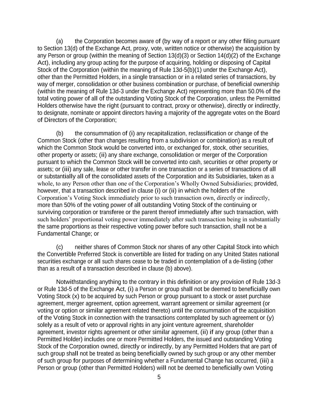 5 (a) the Corporation becomes aware of (by way of a report or any other filing pursuant to Section 13(d) of the Exchange Act, proxy, vote, written notice or otherwise) the acquisition by any Person or group (within the meaning of Section 13(d)(3) or Section 14(d)(2) of the Exchange Act), including any group acting for the purpose of acquiring, holding or disposing of Capital Stock of the Corporation (within the meaning of Rule 13d-5(b)(1) under the Exchange Act), other than the Permitted Holders, in a single transaction or in a related series of transactions, by way of merger, consolidation or other business combination or purchase, of beneficial ownership (within the meaning of Rule 13d-3 under the Exchange Act) representing more than 50.0% of the total voting power of all of the outstanding Voting Stock of the Corporation, unless the Permitted Holders otherwise have the right (pursuant to contract, proxy or otherwise), directly or indirectly, to designate, nominate or appoint directors having a majority of the aggregate votes on the Board of Directors of the Corporation; (b) the consummation of (i) any recapitalization, reclassification or change of the Common Stock (other than changes resulting from a subdivision or combination) as a result of which the Common Stock would be converted into, or exchanged for, stock, other securities, other property or assets; (ii) any share exchange, consolidation or merger of the Corporation pursuant to which the Common Stock will be converted into cash, securities or other property or assets; or (iii) any sale, lease or other transfer in one transaction or a series of transactions of all or substantially all of the consolidated assets of the Corporation and its Subsidiaries, taken as a whole, to any Person other than one of the Corporation’s Wholly Owned Subsidiaries; provided, however, that a transaction described in clause (i) or (ii) in which the holders of the Corporation’s Voting Stock immediately prior to such transaction own, directly or indirectly, more than 50% of the voting power of all outstanding Voting Stock of the continuing or surviving corporation or transferee or the parent thereof immediately after such transaction, with such holders’ proportional voting power immediately after such transaction being in substantially the same proportions as their respective voting power before such transaction, shall not be a Fundamental Change; or (c) neither shares of Common Stock nor shares of any other Capital Stock into which the Convertible Preferred Stock is convertible are listed for trading on any United States national securities exchange or all such shares cease to be traded in contemplation of a de-listing (other than as a result of a transaction described in clause (b) above). Notwithstanding anything to the contrary in this definition or any provision of Rule 13d-3 or Rule 13d-5 of the Exchange Act, (i) a Person or group shall not be deemed to beneficially own Voting Stock (x) to be acquired by such Person or group pursuant to a stock or asset purchase agreement, merger agreement, option agreement, warrant agreement or similar agreement (or voting or option or similar agreement related thereto) until the consummation of the acquisition of the Voting Stock in connection with the transactions contemplated by such agreement or (y) solely as a result of veto or approval rights in any joint venture agreement, shareholder agreement, investor rights agreement or other similar agreement, (ii) if any group (other than a Permitted Holder) includes one or more Permitted Holders, the issued and outstanding Voting Stock of the Corporation owned, directly or indirectly, by any Permitted Holders that are part of such group shall not be treated as being beneficially owned by such group or any other member of such group for purposes of determining whether a Fundamental Change has occurred, (iii) a Person or group (other than Permitted Holders) will not be deemed to beneficially own Voting