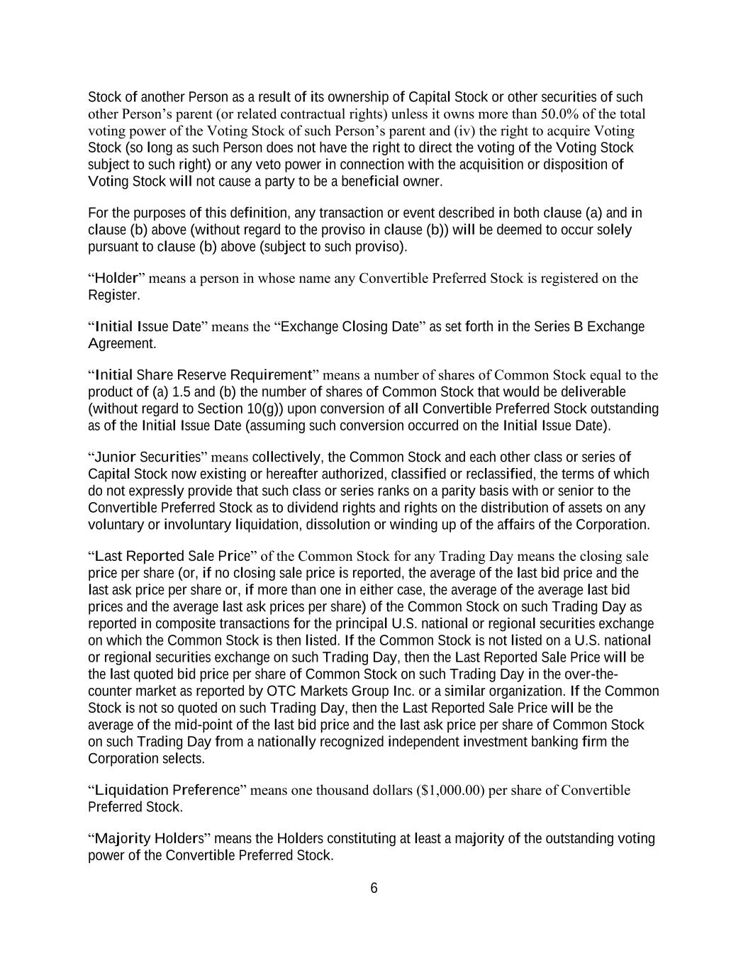 6 Stock of another Person as a result of its ownership of Capital Stock or other securities of such other Person’s parent (or related contractual rights) unless it owns more than 50.0% of the total voting power of the Voting Stock of such Person’s parent and (iv) the right to acquire Voting Stock (so long as such Person does not have the right to direct the voting of the Voting Stock subject to such right) or any veto power in connection with the acquisition or disposition of Voting Stock will not cause a party to be a beneficial owner. For the purposes of this definition, any transaction or event described in both clause (a) and in clause (b) above (without regard to the proviso in clause (b)) will be deemed to occur solely pursuant to clause (b) above (subject to such proviso). “Holder” means a person in whose name any Convertible Preferred Stock is registered on the Register. “Initial Issue Date” means the “Exchange Closing Date” as set forth in the Series B Exchange Agreement. “Initial Share Reserve Requirement” means a number of shares of Common Stock equal to the product of (a) 1.5 and (b) the number of shares of Common Stock that would be deliverable (without regard to Section 10(g)) upon conversion of all Convertible Preferred Stock outstanding as of the Initial Issue Date (assuming such conversion occurred on the Initial Issue Date). “Junior Securities” means collectively, the Common Stock and each other class or series of Capital Stock now existing or hereafter authorized, classified or reclassified, the terms of which do not expressly provide that such class or series ranks on a parity basis with or senior to the Convertible Preferred Stock as to dividend rights and rights on the distribution of assets on any voluntary or involuntary liquidation, dissolution or winding up of the affairs of the Corporation. “Last Reported Sale Price” of the Common Stock for any Trading Day means the closing sale price per share (or, if no closing sale price is reported, the average of the last bid price and the last ask price per share or, if more than one in either case, the average of the average last bid prices and the average last ask prices per share) of the Common Stock on such Trading Day as reported in composite transactions for the principal U.S. national or regional securities exchange on which the Common Stock is then listed. If the Common Stock is not listed on a U.S. national or regional securities exchange on such Trading Day, then the Last Reported Sale Price will be the last quoted bid price per share of Common Stock on such Trading Day in the over-the- counter market as reported by OTC Markets Group Inc. or a similar organization. If the Common Stock is not so quoted on such Trading Day, then the Last Reported Sale Price will be the average of the mid-point of the last bid price and the last ask price per share of Common Stock on such Trading Day from a nationally recognized independent investment banking firm the Corporation selects. “Liquidation Preference” means one thousand dollars ($1,000.00) per share of Convertible Preferred Stock. “Majority Holders” means the Holders constituting at least a majority of the outstanding voting power of the Convertible Preferred Stock.