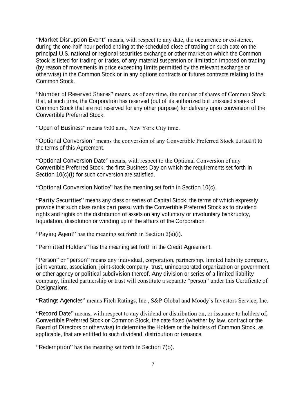 7 “Market Disruption Event” means, with respect to any date, the occurrence or existence, during the one-half hour period ending at the scheduled close of trading on such date on the principal U.S. national or regional securities exchange or other market on which the Common Stock is listed for trading or trades, of any material suspension or limitation imposed on trading (by reason of movements in price exceeding limits permitted by the relevant exchange or otherwise) in the Common Stock or in any options contracts or futures contracts relating to the Common Stock. “Number of Reserved Shares” means, as of any time, the number of shares of Common Stock that, at such time, the Corporation has reserved (out of its authorized but unissued shares of Common Stock that are not reserved for any other purpose) for delivery upon conversion of the Convertible Preferred Stock. “Open of Business” means 9:00 a.m., New York City time. “Optional Conversion” means the conversion of any Convertible Preferred Stock pursuant to the terms of this Agreement. “Optional Conversion Date” means, with respect to the Optional Conversion of any Convertible Preferred Stock, the first Business Day on which the requirements set forth in Section 10(c)(i) for such conversion are satisfied. “Optional Conversion Notice” has the meaning set forth in Section 10(c). “Parity Securities” means any class or series of Capital Stock, the terms of which expressly provide that such class ranks pari passu with the Convertible Preferred Stock as to dividend rights and rights on the distribution of assets on any voluntary or involuntary bankruptcy, liquidation, dissolution or winding up of the affairs of the Corporation. “Paying Agent” has the meaning set forth in Section 3(e)(i). “Permitted Holders” has the meaning set forth in the Credit Agreement. “Person” or “person” means any individual, corporation, partnership, limited liability company, joint venture, association, joint-stock company, trust, unincorporated organization or government or other agency or political subdivision thereof. Any division or series of a limited liability company, limited partnership or trust will constitute a separate “person” under this Certificate of Designations. “Ratings Agencies” means Fitch Ratings, Inc., S&P Global and Moody’s Investors Service, Inc. “Record Date” means, with respect to any dividend or distribution on, or issuance to holders of, Convertible Preferred Stock or Common Stock, the date fixed (whether by law, contract or the Board of Directors or otherwise) to determine the Holders or the holders of Common Stock, as applicable, that are entitled to such dividend, distribution or issuance. “Redemption” has the meaning set forth in Section 7(b).
