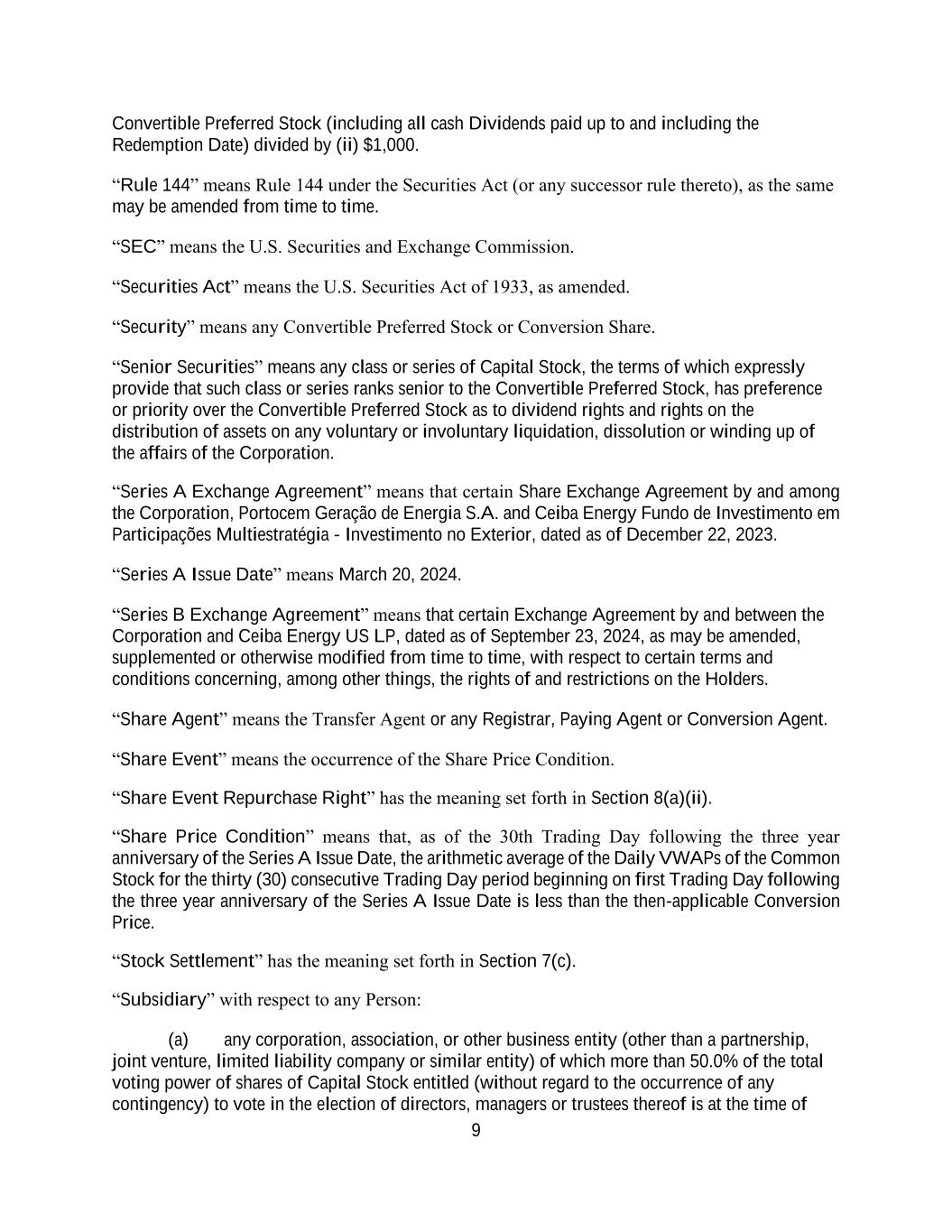 9 Convertible Preferred Stock (including all cash Dividends paid up to and including the Redemption Date) divided by (ii) $1,000. “Rule 144” means Rule 144 under the Securities Act (or any successor rule thereto), as the same may be amended from time to time. “SEC” means the U.S. Securities and Exchange Commission. “Securities Act” means the U.S. Securities Act of 1933, as amended. “Security” means any Convertible Preferred Stock or Conversion Share. “Senior Securities” means any class or series of Capital Stock, the terms of which expressly provide that such class or series ranks senior to the Convertible Preferred Stock, has preference or priority over the Convertible Preferred Stock as to dividend rights and rights on the distribution of assets on any voluntary or involuntary liquidation, dissolution or winding up of the affairs of the Corporation. “Series A Exchange Agreement” means that certain Share Exchange Agreement by and among the Corporation, Portocem Geração de Energia S.A. and Ceiba Energy Fundo de Investimento em Participações Multiestratégia - Investimento no Exterior, dated as of December 22, 2023. “Series A Issue Date” means March 20, 2024. “Series B Exchange Agreement” means that certain Exchange Agreement by and between the Corporation and Ceiba Energy US LP, dated as of September 23, 2024, as may be amended, supplemented or otherwise modified from time to time, with respect to certain terms and conditions concerning, among other things, the rights of and restrictions on the Holders. “Share Agent” means the Transfer Agent or any Registrar, Paying Agent or Conversion Agent. “Share Event” means the occurrence of the Share Price Condition. “Share Event Repurchase Right” has the meaning set forth in Section 8(a)(ii). “Share Price Condition” means that, as of the 30th Trading Day following the three year anniversary of the Series A Issue Date, the arithmetic average of the Daily VWAPs of the Common Stock for the thirty (30) consecutive Trading Day period beginning on first Trading Day following the three year anniversary of the Series A Issue Date is less than the then-applicable Conversion Price. “Stock Settlement” has the meaning set forth in Section 7(c). “Subsidiary” with respect to any Person: (a) any corporation, association, or other business entity (other than a partnership, joint venture, limited liability company or similar entity) of which more than 50.0% of the total voting power of shares of Capital Stock entitled (without regard to the occurrence of any contingency) to vote in the election of directors, managers or trustees thereof is at the time of