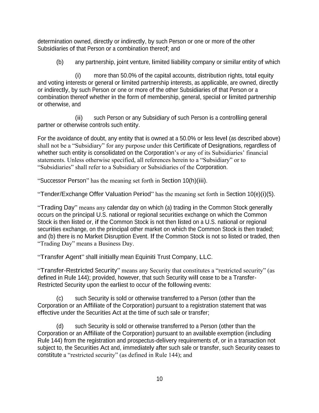 10 determination owned, directly or indirectly, by such Person or one or more of the other Subsidiaries of that Person or a combination thereof; and (b) any partnership, joint venture, limited liability company or similar entity of which (i) more than 50.0% of the capital accounts, distribution rights, total equity and voting interests or general or limited partnership interests, as applicable, are owned, directly or indirectly, by such Person or one or more of the other Subsidiaries of that Person or a combination thereof whether in the form of membership, general, special or limited partnership or otherwise, and (ii) such Person or any Subsidiary of such Person is a controlling general partner or otherwise controls such entity. For the avoidance of doubt, any entity that is owned at a 50.0% or less level (as described above) shall not be a “Subsidiary” for any purpose under this Certificate of Designations, regardless of whether such entity is consolidated on the Corporation’s or any of its Subsidiaries’ financial statements. Unless otherwise specified, all references herein to a “Subsidiary” or to “Subsidiaries” shall refer to a Subsidiary or Subsidiaries of the Corporation. “Successor Person” has the meaning set forth in Section 10(h)(iii). “Tender/Exchange Offer Valuation Period” has the meaning set forth in Section 10(e)(i)(5). “Trading Day” means any calendar day on which (a) trading in the Common Stock generally occurs on the principal U.S. national or regional securities exchange on which the Common Stock is then listed or, if the Common Stock is not then listed on a U.S. national or regional securities exchange, on the principal other market on which the Common Stock is then traded; and (b) there is no Market Disruption Event. If the Common Stock is not so listed or traded, then “Trading Day” means a Business Day. “Transfer Agent” shall initially mean Equiniti Trust Company, LLC. “Transfer-Restricted Security” means any Security that constitutes a “restricted security” (as defined in Rule 144); provided, however, that such Security will cease to be a Transfer- Restricted Security upon the earliest to occur of the following events: (c) such Security is sold or otherwise transferred to a Person (other than the Corporation or an Affiliate of the Corporation) pursuant to a registration statement that was effective under the Securities Act at the time of such sale or transfer; (d) such Security is sold or otherwise transferred to a Person (other than the Corporation or an Affiliate of the Corporation) pursuant to an available exemption (including Rule 144) from the registration and prospectus-delivery requirements of, or in a transaction not subject to, the Securities Act and, immediately after such sale or transfer, such Security ceases to constitute a “restricted security” (as defined in Rule 144); and