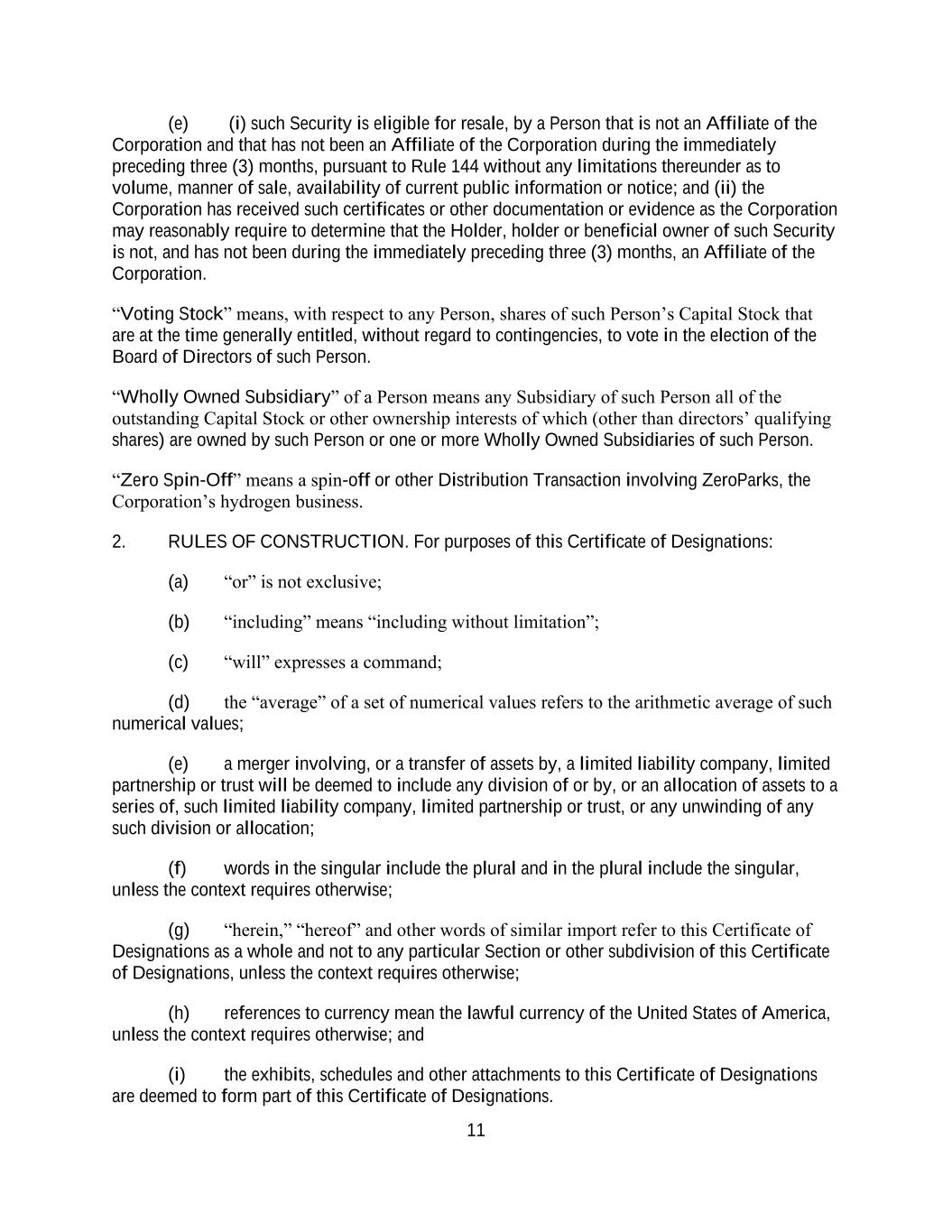 11 (e) (i) such Security is eligible for resale, by a Person that is not an Affiliate of the Corporation and that has not been an Affiliate of the Corporation during the immediately preceding three (3) months, pursuant to Rule 144 without any limitations thereunder as to volume, manner of sale, availability of current public information or notice; and (ii) the Corporation has received such certificates or other documentation or evidence as the Corporation may reasonably require to determine that the Holder, holder or beneficial owner of such Security is not, and has not been during the immediately preceding three (3) months, an Affiliate of the Corporation. “Voting Stock” means, with respect to any Person, shares of such Person’s Capital Stock that are at the time generally entitled, without regard to contingencies, to vote in the election of the Board of Directors of such Person. “Wholly Owned Subsidiary” of a Person means any Subsidiary of such Person all of the outstanding Capital Stock or other ownership interests of which (other than directors’ qualifying shares) are owned by such Person or one or more Wholly Owned Subsidiaries of such Person. “Zero Spin-Off” means a spin-off or other Distribution Transaction involving ZeroParks, the Corporation’s hydrogen business. 2. RULES OF CONSTRUCTION. For purposes of this Certificate of Designations: (a) “or” is not exclusive; (b) “including” means “including without limitation”; (c) “will” expresses a command; (d) the “average” of a set of numerical values refers to the arithmetic average of such numerical values; (e) a merger involving, or a transfer of assets by, a limited liability company, limited partnership or trust will be deemed to include any division of or by, or an allocation of assets to a series of, such limited liability company, limited partnership or trust, or any unwinding of any such division or allocation; (f) words in the singular include the plural and in the plural include the singular, unless the context requires otherwise; (g) “herein,” “hereof” and other words of similar import refer to this Certificate of Designations as a whole and not to any particular Section or other subdivision of this Certificate of Designations, unless the context requires otherwise; (h) references to currency mean the lawful currency of the United States of America, unless the context requires otherwise; and (i) the exhibits, schedules and other attachments to this Certificate of Designations are deemed to form part of this Certificate of Designations.
