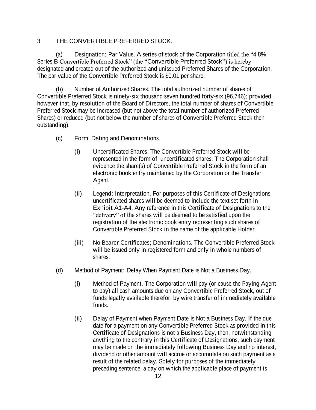12 3. THE CONVERTIBLE PREFERRED STOCK. (a) Designation; Par Value. A series of stock of the Corporation titled the “4.8% Series B Convertible Preferred Stock” (the “Convertible Preferred Stock”) is hereby designated and created out of the authorized and unissued Preferred Shares of the Corporation. The par value of the Convertible Preferred Stock is $0.01 per share. (b) Number of Authorized Shares. The total authorized number of shares of Convertible Preferred Stock is ninety-six thousand seven hundred forty-six (96,746); provided, however that, by resolution of the Board of Directors, the total number of shares of Convertible Preferred Stock may be increased (but not above the total number of authorized Preferred Shares) or reduced (but not below the number of shares of Convertible Preferred Stock then outstanding). (c) Form, Dating and Denominations. (i) Uncertificated Shares. The Convertible Preferred Stock will be represented in the form of uncertificated shares. The Corporation shall evidence the share(s) of Convertible Preferred Stock in the form of an electronic book entry maintained by the Corporation or the Transfer Agent. (ii) Legend; Interpretation. For purposes of this Certificate of Designations, uncertificated shares will be deemed to include the text set forth in Exhibit A1-A4. Any reference in this Certificate of Designations to the “delivery” of the shares will be deemed to be satisfied upon the registration of the electronic book entry representing such shares of Convertible Preferred Stock in the name of the applicable Holder. (iii) No Bearer Certificates; Denominations. The Convertible Preferred Stock will be issued only in registered form and only in whole numbers of shares. (d) Method of Payment; Delay When Payment Date is Not a Business Day. (i) Method of Payment. The Corporation will pay (or cause the Paying Agent to pay) all cash amounts due on any Convertible Preferred Stock, out of funds legally available therefor, by wire transfer of immediately available funds. (ii) Delay of Payment when Payment Date is Not a Business Day. If the due date for a payment on any Convertible Preferred Stock as provided in this Certificate of Designations is not a Business Day, then, notwithstanding anything to the contrary in this Certificate of Designations, such payment may be made on the immediately following Business Day and no interest, dividend or other amount will accrue or accumulate on such payment as a result of the related delay. Solely for purposes of the immediately preceding sentence, a day on which the applicable place of payment is