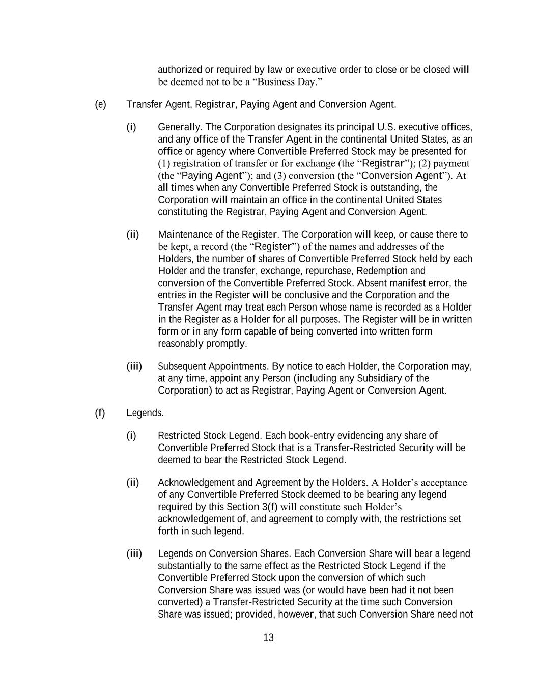 13 authorized or required by law or executive order to close or be closed will be deemed not to be a “Business Day.” (e) Transfer Agent, Registrar, Paying Agent and Conversion Agent. (i) Generally. The Corporation designates its principal U.S. executive offices, and any office of the Transfer Agent in the continental United States, as an office or agency where Convertible Preferred Stock may be presented for (1) registration of transfer or for exchange (the “Registrar”); (2) payment (the “Paying Agent”); and (3) conversion (the “Conversion Agent”). At all times when any Convertible Preferred Stock is outstanding, the Corporation will maintain an office in the continental United States constituting the Registrar, Paying Agent and Conversion Agent. (ii) Maintenance of the Register. The Corporation will keep, or cause there to be kept, a record (the “Register”) of the names and addresses of the Holders, the number of shares of Convertible Preferred Stock held by each Holder and the transfer, exchange, repurchase, Redemption and conversion of the Convertible Preferred Stock. Absent manifest error, the entries in the Register will be conclusive and the Corporation and the Transfer Agent may treat each Person whose name is recorded as a Holder in the Register as a Holder for all purposes. The Register will be in written form or in any form capable of being converted into written form reasonably promptly. (iii) Subsequent Appointments. By notice to each Holder, the Corporation may, at any time, appoint any Person (including any Subsidiary of the Corporation) to act as Registrar, Paying Agent or Conversion Agent. (f) Legends. (i) Restricted Stock Legend. Each book-entry evidencing any share of Convertible Preferred Stock that is a Transfer-Restricted Security will be deemed to bear the Restricted Stock Legend. (ii) Acknowledgement and Agreement by the Holders. A Holder’s acceptance of any Convertible Preferred Stock deemed to be bearing any legend required by this Section 3(f) will constitute such Holder’s acknowledgement of, and agreement to comply with, the restrictions set forth in such legend. (iii) Legends on Conversion Shares. Each Conversion Share will bear a legend substantially to the same effect as the Restricted Stock Legend if the Convertible Preferred Stock upon the conversion of which such Conversion Share was issued was (or would have been had it not been converted) a Transfer-Restricted Security at the time such Conversion Share was issued; provided, however, that such Conversion Share need not