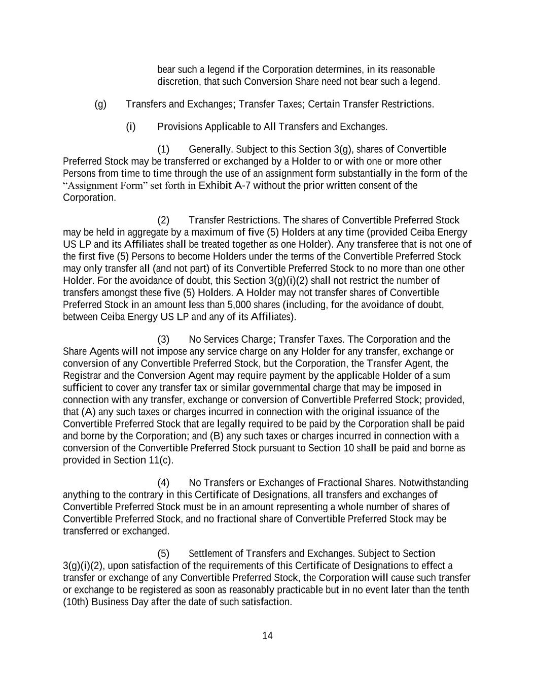 14 bear such a legend if the Corporation determines, in its reasonable discretion, that such Conversion Share need not bear such a legend. (g) Transfers and Exchanges; Transfer Taxes; Certain Transfer Restrictions. (i) Provisions Applicable to All Transfers and Exchanges. (1) Generally. Subject to this Section 3(g), shares of Convertible Preferred Stock may be transferred or exchanged by a Holder to or with one or more other Persons from time to time through the use of an assignment form substantially in the form of the “Assignment Form” set forth in Exhibit A-7 without the prior written consent of the Corporation. (2) Transfer Restrictions. The shares of Convertible Preferred Stock may be held in aggregate by a maximum of five (5) Holders at any time (provided Ceiba Energy US LP and its Affiliates shall be treated together as one Holder). Any transferee that is not one of the first five (5) Persons to become Holders under the terms of the Convertible Preferred Stock may only transfer all (and not part) of its Convertible Preferred Stock to no more than one other Holder. For the avoidance of doubt, this Section 3(g)(i)(2) shall not restrict the number of transfers amongst these five (5) Holders. A Holder may not transfer shares of Convertible Preferred Stock in an amount less than 5,000 shares (including, for the avoidance of doubt, between Ceiba Energy US LP and any of its Affiliates). (3) No Services Charge; Transfer Taxes. The Corporation and the Share Agents will not impose any service charge on any Holder for any transfer, exchange or conversion of any Convertible Preferred Stock, but the Corporation, the Transfer Agent, the Registrar and the Conversion Agent may require payment by the applicable Holder of a sum sufficient to cover any transfer tax or similar governmental charge that may be imposed in connection with any transfer, exchange or conversion of Convertible Preferred Stock; provided, that (A) any such taxes or charges incurred in connection with the original issuance of the Convertible Preferred Stock that are legally required to be paid by the Corporation shall be paid and borne by the Corporation; and (B) any such taxes or charges incurred in connection with a conversion of the Convertible Preferred Stock pursuant to Section 10 shall be paid and borne as provided in Section 11(c). (4) No Transfers or Exchanges of Fractional Shares. Notwithstanding anything to the contrary in this Certificate of Designations, all transfers and exchanges of Convertible Preferred Stock must be in an amount representing a whole number of shares of Convertible Preferred Stock, and no fractional share of Convertible Preferred Stock may be transferred or exchanged. (5) Settlement of Transfers and Exchanges. Subject to Section 3(g)(i)(2), upon satisfaction of the requirements of this Certificate of Designations to effect a transfer or exchange of any Convertible Preferred Stock, the Corporation will cause such transfer or exchange to be registered as soon as reasonably practicable but in no event later than the tenth (10th) Business Day after the date of such satisfaction.