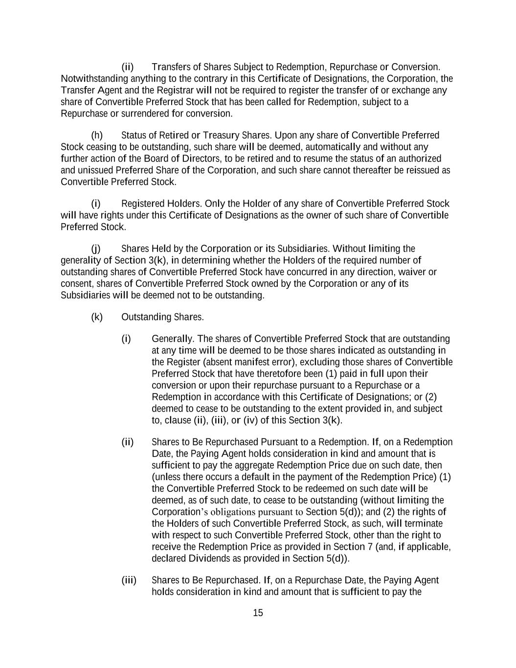 15 (ii) Transfers of Shares Subject to Redemption, Repurchase or Conversion. Notwithstanding anything to the contrary in this Certificate of Designations, the Corporation, the Transfer Agent and the Registrar will not be required to register the transfer of or exchange any share of Convertible Preferred Stock that has been called for Redemption, subject to a Repurchase or surrendered for conversion. (h) Status of Retired or Treasury Shares. Upon any share of Convertible Preferred Stock ceasing to be outstanding, such share will be deemed, automatically and without any further action of the Board of Directors, to be retired and to resume the status of an authorized and unissued Preferred Share of the Corporation, and such share cannot thereafter be reissued as Convertible Preferred Stock. (i) Registered Holders. Only the Holder of any share of Convertible Preferred Stock will have rights under this Certificate of Designations as the owner of such share of Convertible Preferred Stock. (j) Shares Held by the Corporation or its Subsidiaries. Without limiting the generality of Section 3(k), in determining whether the Holders of the required number of outstanding shares of Convertible Preferred Stock have concurred in any direction, waiver or consent, shares of Convertible Preferred Stock owned by the Corporation or any of its Subsidiaries will be deemed not to be outstanding. (k) Outstanding Shares. (i) Generally. The shares of Convertible Preferred Stock that are outstanding at any time will be deemed to be those shares indicated as outstanding in the Register (absent manifest error), excluding those shares of Convertible Preferred Stock that have theretofore been (1) paid in full upon their conversion or upon their repurchase pursuant to a Repurchase or a Redemption in accordance with this Certificate of Designations; or (2) deemed to cease to be outstanding to the extent provided in, and subject to, clause (ii), (iii), or (iv) of this Section 3(k). (ii) Shares to Be Repurchased Pursuant to a Redemption. If, on a Redemption Date, the Paying Agent holds consideration in kind and amount that is sufficient to pay the aggregate Redemption Price due on such date, then (unless there occurs a default in the payment of the Redemption Price) (1) the Convertible Preferred Stock to be redeemed on such date will be deemed, as of such date, to cease to be outstanding (without limiting the Corporation’s obligations pursuant to Section 5(d)); and (2) the rights of the Holders of such Convertible Preferred Stock, as such, will terminate with respect to such Convertible Preferred Stock, other than the right to receive the Redemption Price as provided in Section 7 (and, if applicable, declared Dividends as provided in Section 5(d)). (iii) Shares to Be Repurchased. If, on a Repurchase Date, the Paying Agent holds consideration in kind and amount that is sufficient to pay the