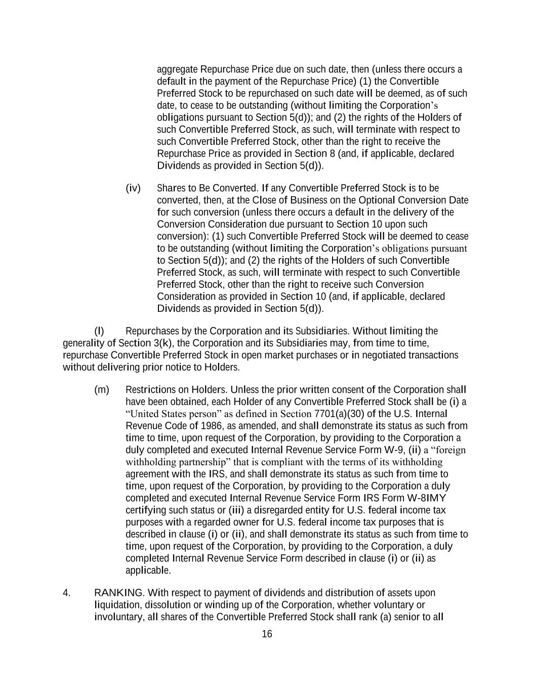 16 aggregate Repurchase Price due on such date, then (unless there occurs a default in the payment of the Repurchase Price) (1) the Convertible Preferred Stock to be repurchased on such date will be deemed, as of such date, to cease to be outstanding (without limiting the Corporation’s obligations pursuant to Section 5(d)); and (2) the rights of the Holders of such Convertible Preferred Stock, as such, will terminate with respect to such Convertible Preferred Stock, other than the right to receive the Repurchase Price as provided in Section 8 (and, if applicable, declared Dividends as provided in Section 5(d)). (iv) Shares to Be Converted. If any Convertible Preferred Stock is to be converted, then, at the Close of Business on the Optional Conversion Date for such conversion (unless there occurs a default in the delivery of the Conversion Consideration due pursuant to Section 10 upon such conversion): (1) such Convertible Preferred Stock will be deemed to cease to be outstanding (without limiting the Corporation’s obligations pursuant to Section 5(d)); and (2) the rights of the Holders of such Convertible Preferred Stock, as such, will terminate with respect to such Convertible Preferred Stock, other than the right to receive such Conversion Consideration as provided in Section 10 (and, if applicable, declared Dividends as provided in Section 5(d)). (l) Repurchases by the Corporation and its Subsidiaries. Without limiting the generality of Section 3(k), the Corporation and its Subsidiaries may, from time to time, repurchase Convertible Preferred Stock in open market purchases or in negotiated transactions without delivering prior notice to Holders. (m) Restrictions on Holders. Unless the prior written consent of the Corporation shall have been obtained, each Holder of any Convertible Preferred Stock shall be (i) a “United States person” as defined in Section 7701(a)(30) of the U.S. Internal Revenue Code of 1986, as amended, and shall demonstrate its status as such from time to time, upon request of the Corporation, by providing to the Corporation a duly completed and executed Internal Revenue Service Form W-9, (ii) a “foreign withholding partnership” that is compliant with the terms of its withholding agreement with the IRS, and shall demonstrate its status as such from time to time, upon request of the Corporation, by providing to the Corporation a duly completed and executed Internal Revenue Service Form IRS Form W-8IMY certifying such status or (iii) a disregarded entity for U.S. federal income tax purposes with a regarded owner for U.S. federal income tax purposes that is described in clause (i) or (ii), and shall demonstrate its status as such from time to time, upon request of the Corporation, by providing to the Corporation, a duly completed Internal Revenue Service Form described in clause (i) or (ii) as applicable. 4. RANKING. With respect to payment of dividends and distribution of assets upon liquidation, dissolution or winding up of the Corporation, whether voluntary or involuntary, all shares of the Convertible Preferred Stock shall rank (a) senior to all