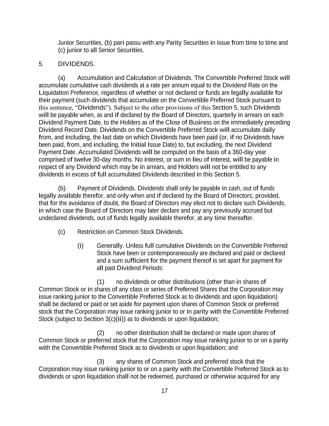 17 Junior Securities, (b) pari passu with any Parity Securities in issue from time to time and (c) junior to all Senior Securities. 5. DIVIDENDS. (a) Accumulation and Calculation of Dividends. The Convertible Preferred Stock will accumulate cumulative cash dividends at a rate per annum equal to the Dividend Rate on the Liquidation Preference, regardless of whether or not declared or funds are legally available for their payment (such dividends that accumulate on the Convertible Preferred Stock pursuant to this sentence, “Dividends”). Subject to the other provisions of this Section 5, such Dividends will be payable when, as and if declared by the Board of Directors, quarterly in arrears on each Dividend Payment Date, to the Holders as of the Close of Business on the immediately preceding Dividend Record Date. Dividends on the Convertible Preferred Stock will accumulate daily from, and including, the last date on which Dividends have been paid (or, if no Dividends have been paid, from, and including, the Initial Issue Date) to, but excluding, the next Dividend Payment Date. Accumulated Dividends will be computed on the basis of a 360-day year comprised of twelve 30-day months. No interest, or sum in lieu of interest, will be payable in respect of any Dividend which may be in arrears, and Holders will not be entitled to any dividends in excess of full accumulated Dividends described in this Section 5. (b) Payment of Dividends. Dividends shall only be payable in cash, out of funds legally available therefor, and only when and if declared by the Board of Directors; provided, that for the avoidance of doubt, the Board of Directors may elect not to declare such Dividends, in which case the Board of Directors may later declare and pay any previously accrued but undeclared dividends, out of funds legally available therefor, at any time thereafter. (c) Restriction on Common Stock Dividends. (i) Generally. Unless full cumulative Dividends on the Convertible Preferred Stock have been or contemporaneously are declared and paid or declared and a sum sufficient for the payment thereof is set apart for payment for all past Dividend Periods: (1) no dividends or other distributions (other than in shares of Common Stock or in shares of any class or series of Preferred Shares that the Corporation may issue ranking junior to the Convertible Preferred Stock as to dividends and upon liquidation) shall be declared or paid or set aside for payment upon shares of Common Stock or preferred stock that the Corporation may issue ranking junior to or in parity with the Convertible Preferred Stock (subject to Section 3(c)(ii)) as to dividends or upon liquidation; (2) no other distribution shall be declared or made upon shares of Common Stock or preferred stock that the Corporation may issue ranking junior to or on a parity with the Convertible Preferred Stock as to dividends or upon liquidation; and (3) any shares of Common Stock and preferred stock that the Corporation may issue ranking junior to or on a parity with the Convertible Preferred Stock as to dividends or upon liquidation shall not be redeemed, purchased or otherwise acquired for any
