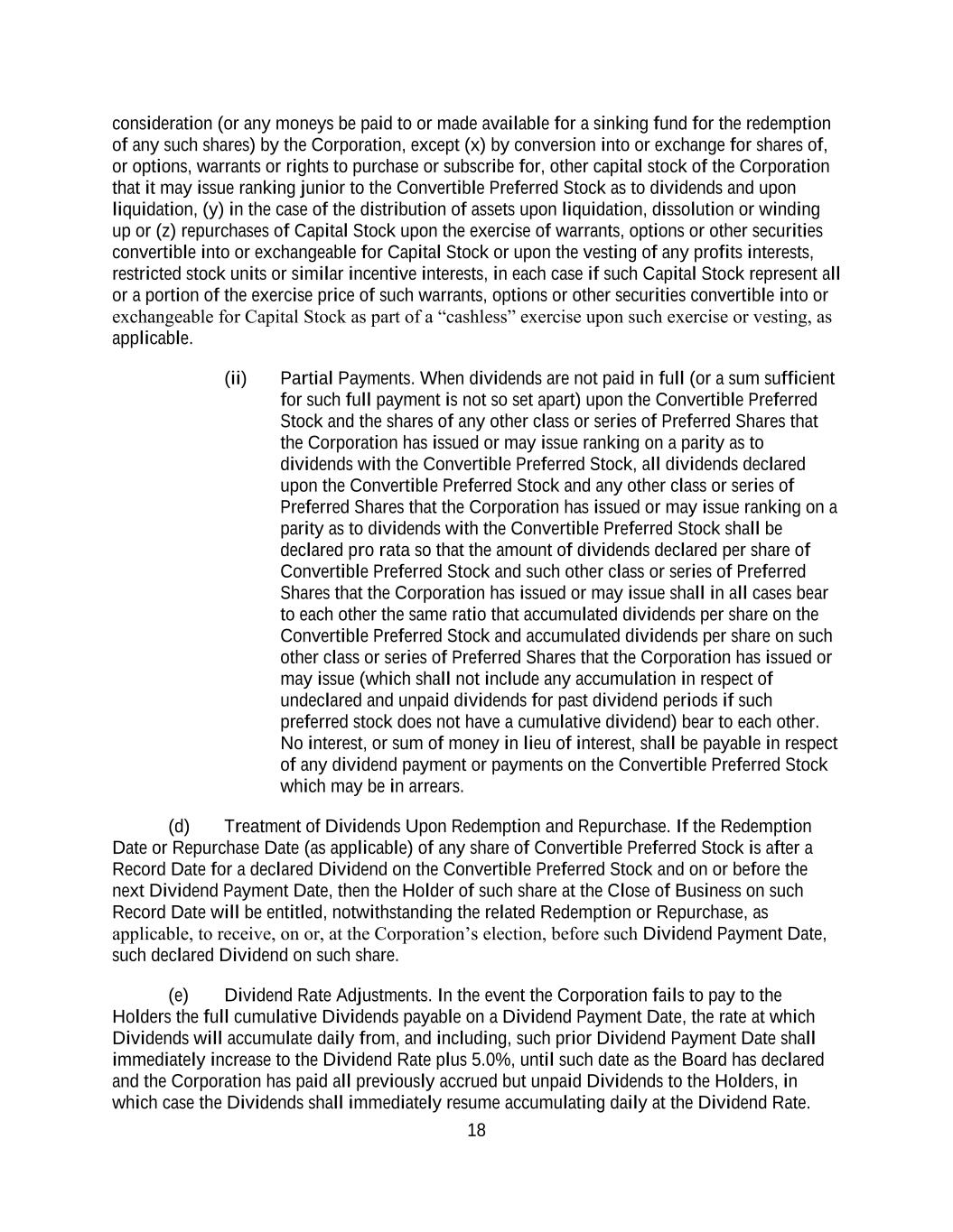 18 consideration (or any moneys be paid to or made available for a sinking fund for the redemption of any such shares) by the Corporation, except (x) by conversion into or exchange for shares of, or options, warrants or rights to purchase or subscribe for, other capital stock of the Corporation that it may issue ranking junior to the Convertible Preferred Stock as to dividends and upon liquidation, (y) in the case of the distribution of assets upon liquidation, dissolution or winding up or (z) repurchases of Capital Stock upon the exercise of warrants, options or other securities convertible into or exchangeable for Capital Stock or upon the vesting of any profits interests, restricted stock units or similar incentive interests, in each case if such Capital Stock represent all or a portion of the exercise price of such warrants, options or other securities convertible into or exchangeable for Capital Stock as part of a “cashless” exercise upon such exercise or vesting, as applicable. (ii) Partial Payments. When dividends are not paid in full (or a sum sufficient for such full payment is not so set apart) upon the Convertible Preferred Stock and the shares of any other class or series of Preferred Shares that the Corporation has issued or may issue ranking on a parity as to dividends with the Convertible Preferred Stock, all dividends declared upon the Convertible Preferred Stock and any other class or series of Preferred Shares that the Corporation has issued or may issue ranking on a parity as to dividends with the Convertible Preferred Stock shall be declared pro rata so that the amount of dividends declared per share of Convertible Preferred Stock and such other class or series of Preferred Shares that the Corporation has issued or may issue shall in all cases bear to each other the same ratio that accumulated dividends per share on the Convertible Preferred Stock and accumulated dividends per share on such other class or series of Preferred Shares that the Corporation has issued or may issue (which shall not include any accumulation in respect of undeclared and unpaid dividends for past dividend periods if such preferred stock does not have a cumulative dividend) bear to each other. No interest, or sum of money in lieu of interest, shall be payable in respect of any dividend payment or payments on the Convertible Preferred Stock which may be in arrears. (d) Treatment of Dividends Upon Redemption and Repurchase. If the Redemption Date or Repurchase Date (as applicable) of any share of Convertible Preferred Stock is after a Record Date for a declared Dividend on the Convertible Preferred Stock and on or before the next Dividend Payment Date, then the Holder of such share at the Close of Business on such Record Date will be entitled, notwithstanding the related Redemption or Repurchase, as applicable, to receive, on or, at the Corporation’s election, before such Dividend Payment Date, such declared Dividend on such share. (e) Dividend Rate Adjustments. In the event the Corporation fails to pay to the Holders the full cumulative Dividends payable on a Dividend Payment Date, the rate at which Dividends will accumulate daily from, and including, such prior Dividend Payment Date shall immediately increase to the Dividend Rate plus 5.0%, until such date as the Board has declared and the Corporation has paid all previously accrued but unpaid Dividends to the Holders, in which case the Dividends shall immediately resume accumulating daily at the Dividend Rate.
