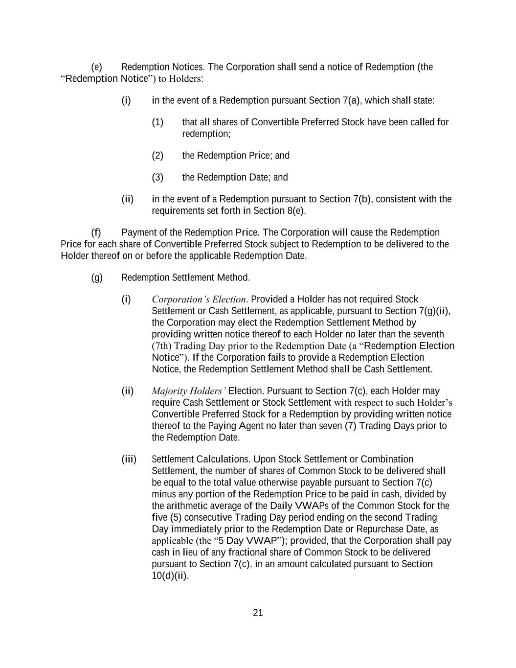 21 (e) Redemption Notices. The Corporation shall send a notice of Redemption (the “Redemption Notice”) to Holders: (i) in the event of a Redemption pursuant Section 7(a), which shall state: (1) that all shares of Convertible Preferred Stock have been called for redemption; (2) the Redemption Price; and (3) the Redemption Date; and (ii) in the event of a Redemption pursuant to Section 7(b), consistent with the requirements set forth in Section 8(e). (f) Payment of the Redemption Price. The Corporation will cause the Redemption Price for each share of Convertible Preferred Stock subject to Redemption to be delivered to the Holder thereof on or before the applicable Redemption Date. (g) Redemption Settlement Method. (i) Corporation’s Election. Provided a Holder has not required Stock Settlement or Cash Settlement, as applicable, pursuant to Section 7(g)(ii), the Corporation may elect the Redemption Settlement Method by providing written notice thereof to each Holder no later than the seventh (7th) Trading Day prior to the Redemption Date (a “Redemption Election Notice”). If the Corporation fails to provide a Redemption Election Notice, the Redemption Settlement Method shall be Cash Settlement. (ii) Majority Holders’ Election. Pursuant to Section 7(c), each Holder may require Cash Settlement or Stock Settlement with respect to such Holder’s Convertible Preferred Stock for a Redemption by providing written notice thereof to the Paying Agent no later than seven (7) Trading Days prior to the Redemption Date. (iii) Settlement Calculations. Upon Stock Settlement or Combination Settlement, the number of shares of Common Stock to be delivered shall be equal to the total value otherwise payable pursuant to Section 7(c) minus any portion of the Redemption Price to be paid in cash, divided by the arithmetic average of the Daily VWAPs of the Common Stock for the five (5) consecutive Trading Day period ending on the second Trading Day immediately prior to the Redemption Date or Repurchase Date, as applicable (the “5 Day VWAP”); provided, that the Corporation shall pay cash in lieu of any fractional share of Common Stock to be delivered pursuant to Section 7(c), in an amount calculated pursuant to Section 10(d)(ii).