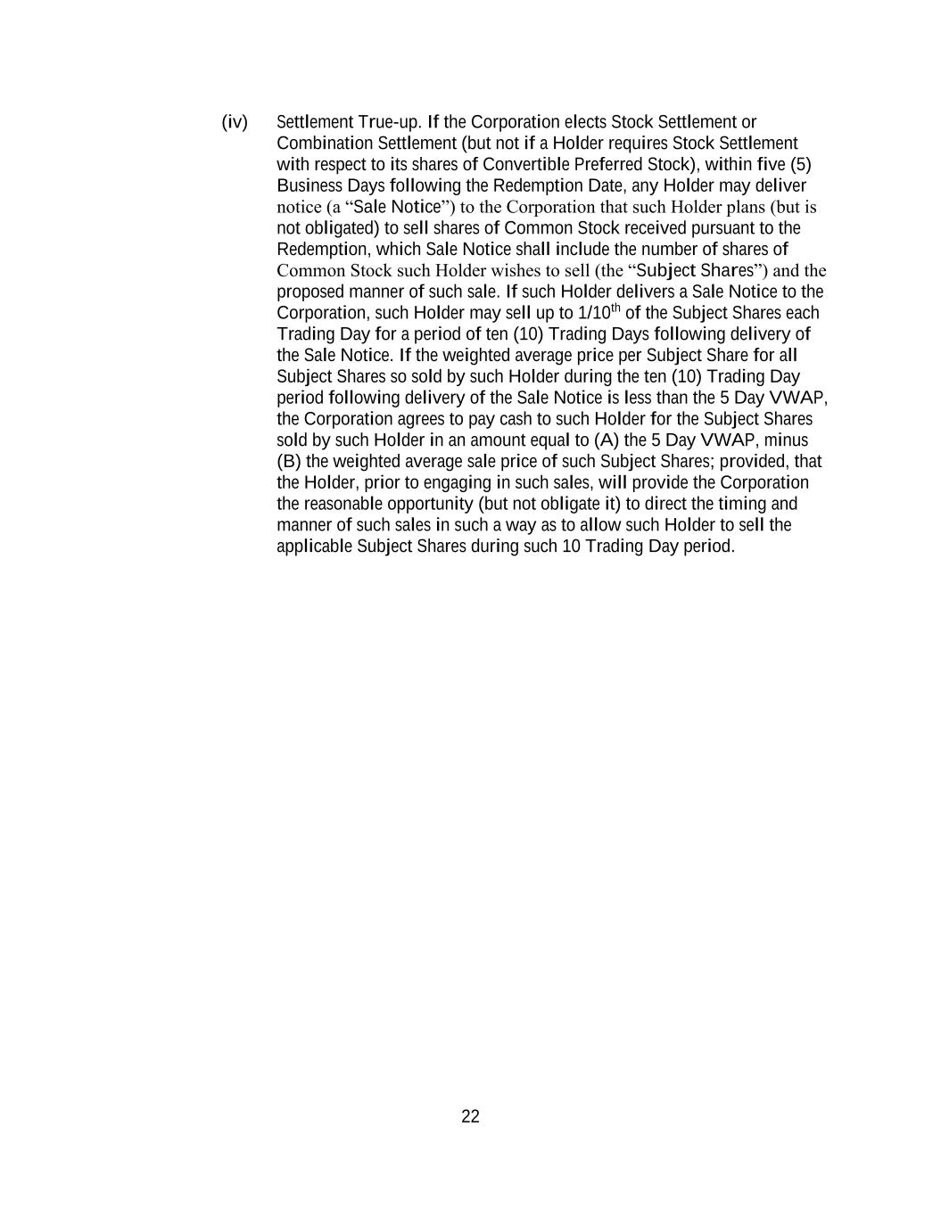 22 (iv) Settlement True-up. If the Corporation elects Stock Settlement or Combination Settlement (but not if a Holder requires Stock Settlement with respect to its shares of Convertible Preferred Stock), within five (5) Business Days following the Redemption Date, any Holder may deliver notice (a “Sale Notice”) to the Corporation that such Holder plans (but is not obligated) to sell shares of Common Stock received pursuant to the Redemption, which Sale Notice shall include the number of shares of Common Stock such Holder wishes to sell (the “Subject Shares”) and the proposed manner of such sale. If such Holder delivers a Sale Notice to the Corporation, such Holder may sell up to 1/10th of the Subject Shares each Trading Day for a period of ten (10) Trading Days following delivery of the Sale Notice. If the weighted average price per Subject Share for all Subject Shares so sold by such Holder during the ten (10) Trading Day period following delivery of the Sale Notice is less than the 5 Day VWAP, the Corporation agrees to pay cash to such Holder for the Subject Shares sold by such Holder in an amount equal to (A) the 5 Day VWAP, minus (B) the weighted average sale price of such Subject Shares; provided, that the Holder, prior to engaging in such sales, will provide the Corporation the reasonable opportunity (but not obligate it) to direct the timing and manner of such sales in such a way as to allow such Holder to sell the applicable Subject Shares during such 10 Trading Day period.