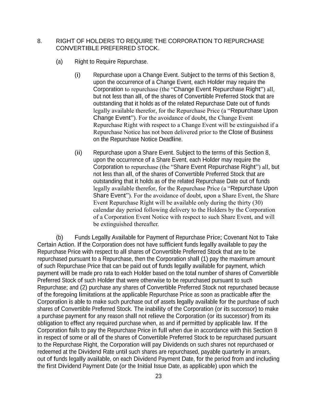 23 8. RIGHT OF HOLDERS TO REQUIRE THE CORPORATION TO REPURCHASE CONVERTIBLE PREFERRED STOCK. (a) Right to Require Repurchase. (i) Repurchase upon a Change Event. Subject to the terms of this Section 8, upon the occurrence of a Change Event, each Holder may require the Corporation to repurchase (the “Change Event Repurchase Right”) all, but not less than all, of the shares of Convertible Preferred Stock that are outstanding that it holds as of the related Repurchase Date out of funds legally available therefor, for the Repurchase Price (a “Repurchase Upon Change Event”). For the avoidance of doubt, the Change Event Repurchase Right with respect to a Change Event will be extinguished if a Repurchase Notice has not been delivered prior to the Close of Business on the Repurchase Notice Deadline. (ii) Repurchase upon a Share Event. Subject to the terms of this Section 8, upon the occurrence of a Share Event, each Holder may require the Corporation to repurchase (the “Share Event Repurchase Right”) all, but not less than all, of the shares of Convertible Preferred Stock that are outstanding that it holds as of the related Repurchase Date out of funds legally available therefor, for the Repurchase Price (a “Repurchase Upon Share Event”). For the avoidance of doubt, upon a Share Event, the Share Event Repurchase Right will be available only during the thirty (30) calendar day period following delivery to the Holders by the Corporation of a Corporation Event Notice with respect to such Share Event, and will be extinguished thereafter. (b) Funds Legally Available for Payment of Repurchase Price; Covenant Not to Take Certain Action. If the Corporation does not have sufficient funds legally available to pay the Repurchase Price with respect to all shares of Convertible Preferred Stock that are to be repurchased pursuant to a Repurchase, then the Corporation shall (1) pay the maximum amount of such Repurchase Price that can be paid out of funds legally available for payment, which payment will be made pro rata to each Holder based on the total number of shares of Convertible Preferred Stock of such Holder that were otherwise to be repurchased pursuant to such Repurchase; and (2) purchase any shares of Convertible Preferred Stock not repurchased because of the foregoing limitations at the applicable Repurchase Price as soon as practicable after the Corporation is able to make such purchase out of assets legally available for the purchase of such shares of Convertible Preferred Stock. The inability of the Corporation (or its successor) to make a purchase payment for any reason shall not relieve the Corporation (or its successor) from its obligation to effect any required purchase when, as and if permitted by applicable law. If the Corporation fails to pay the Repurchase Price in full when due in accordance with this Section 8 in respect of some or all of the shares of Convertible Preferred Stock to be repurchased pursuant to the Repurchase Right, the Corporation will pay Dividends on such shares not repurchased or redeemed at the Dividend Rate until such shares are repurchased, payable quarterly in arrears, out of funds legally available, on each Dividend Payment Date, for the period from and including the first Dividend Payment Date (or the Initial Issue Date, as applicable) upon which the