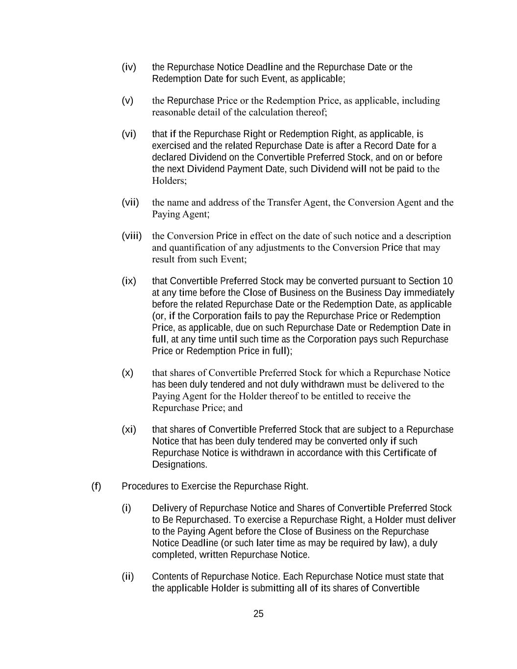 25 (iv) the Repurchase Notice Deadline and the Repurchase Date or the Redemption Date for such Event, as applicable; (v) the Repurchase Price or the Redemption Price, as applicable, including reasonable detail of the calculation thereof; (vi) that if the Repurchase Right or Redemption Right, as applicable, is exercised and the related Repurchase Date is after a Record Date for a declared Dividend on the Convertible Preferred Stock, and on or before the next Dividend Payment Date, such Dividend will not be paid to the Holders; (vii) the name and address of the Transfer Agent, the Conversion Agent and the Paying Agent; (viii) the Conversion Price in effect on the date of such notice and a description and quantification of any adjustments to the Conversion Price that may result from such Event; (ix) that Convertible Preferred Stock may be converted pursuant to Section 10 at any time before the Close of Business on the Business Day immediately before the related Repurchase Date or the Redemption Date, as applicable (or, if the Corporation fails to pay the Repurchase Price or Redemption Price, as applicable, due on such Repurchase Date or Redemption Date in full, at any time until such time as the Corporation pays such Repurchase Price or Redemption Price in full); (x) that shares of Convertible Preferred Stock for which a Repurchase Notice has been duly tendered and not duly withdrawn must be delivered to the Paying Agent for the Holder thereof to be entitled to receive the Repurchase Price; and (xi) that shares of Convertible Preferred Stock that are subject to a Repurchase Notice that has been duly tendered may be converted only if such Repurchase Notice is withdrawn in accordance with this Certificate of Designations. (f) Procedures to Exercise the Repurchase Right. (i) Delivery of Repurchase Notice and Shares of Convertible Preferred Stock to Be Repurchased. To exercise a Repurchase Right, a Holder must deliver to the Paying Agent before the Close of Business on the Repurchase Notice Deadline (or such later time as may be required by law), a duly completed, written Repurchase Notice. (ii) Contents of Repurchase Notice. Each Repurchase Notice must state that the applicable Holder is submitting all of its shares of Convertible