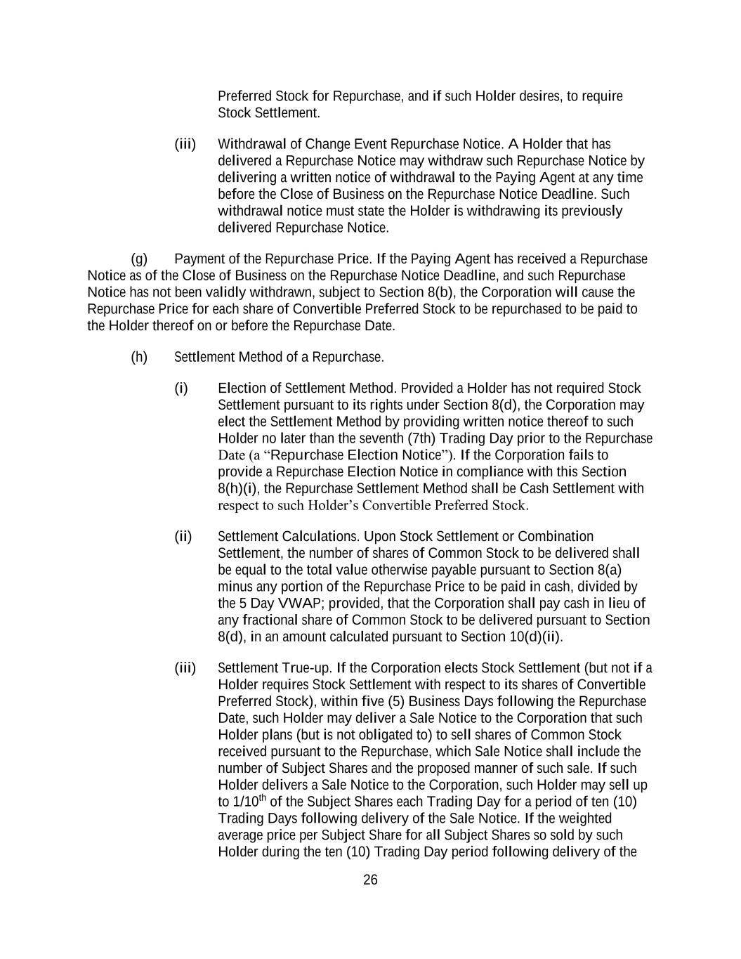 26 Preferred Stock for Repurchase, and if such Holder desires, to require Stock Settlement. (iii) Withdrawal of Change Event Repurchase Notice. A Holder that has delivered a Repurchase Notice may withdraw such Repurchase Notice by delivering a written notice of withdrawal to the Paying Agent at any time before the Close of Business on the Repurchase Notice Deadline. Such withdrawal notice must state the Holder is withdrawing its previously delivered Repurchase Notice. (g) Payment of the Repurchase Price. If the Paying Agent has received a Repurchase Notice as of the Close of Business on the Repurchase Notice Deadline, and such Repurchase Notice has not been validly withdrawn, subject to Section 8(b), the Corporation will cause the Repurchase Price for each share of Convertible Preferred Stock to be repurchased to be paid to the Holder thereof on or before the Repurchase Date. (h) Settlement Method of a Repurchase. (i) Election of Settlement Method. Provided a Holder has not required Stock Settlement pursuant to its rights under Section 8(d), the Corporation may elect the Settlement Method by providing written notice thereof to such Holder no later than the seventh (7th) Trading Day prior to the Repurchase Date (a “Repurchase Election Notice”). If the Corporation fails to provide a Repurchase Election Notice in compliance with this Section 8(h)(i), the Repurchase Settlement Method shall be Cash Settlement with respect to such Holder’s Convertible Preferred Stock. (ii) Settlement Calculations. Upon Stock Settlement or Combination Settlement, the number of shares of Common Stock to be delivered shall be equal to the total value otherwise payable pursuant to Section 8(a) minus any portion of the Repurchase Price to be paid in cash, divided by the 5 Day VWAP; provided, that the Corporation shall pay cash in lieu of any fractional share of Common Stock to be delivered pursuant to Section 8(d), in an amount calculated pursuant to Section 10(d)(ii). (iii) Settlement True-up. If the Corporation elects Stock Settlement (but not if a Holder requires Stock Settlement with respect to its shares of Convertible Preferred Stock), within five (5) Business Days following the Repurchase Date, such Holder may deliver a Sale Notice to the Corporation that such Holder plans (but is not obligated to) to sell shares of Common Stock received pursuant to the Repurchase, which Sale Notice shall include the number of Subject Shares and the proposed manner of such sale. If such Holder delivers a Sale Notice to the Corporation, such Holder may sell up to 1/10th of the Subject Shares each Trading Day for a period of ten (10) Trading Days following delivery of the Sale Notice. If the weighted average price per Subject Share for all Subject Shares so sold by such Holder during the ten (10) Trading Day period following delivery of the