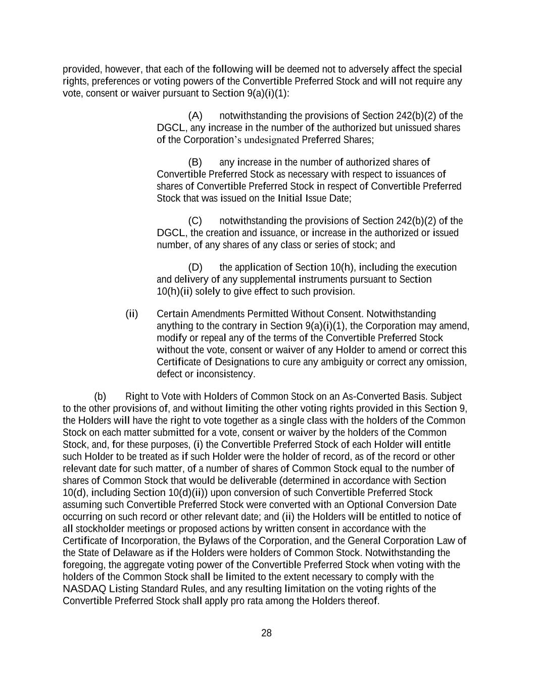 28 provided, however, that each of the following will be deemed not to adversely affect the special rights, preferences or voting powers of the Convertible Preferred Stock and will not require any vote, consent or waiver pursuant to Section 9(a)(i)(1): (A) notwithstanding the provisions of Section 242(b)(2) of the DGCL, any increase in the number of the authorized but unissued shares of the Corporation’s undesignated Preferred Shares; (B) any increase in the number of authorized shares of Convertible Preferred Stock as necessary with respect to issuances of shares of Convertible Preferred Stock in respect of Convertible Preferred Stock that was issued on the Initial Issue Date; (C) notwithstanding the provisions of Section 242(b)(2) of the DGCL, the creation and issuance, or increase in the authorized or issued number, of any shares of any class or series of stock; and (D) the application of Section 10(h), including the execution and delivery of any supplemental instruments pursuant to Section 10(h)(ii) solely to give effect to such provision. (ii) Certain Amendments Permitted Without Consent. Notwithstanding anything to the contrary in Section 9(a)(i)(1), the Corporation may amend, modify or repeal any of the terms of the Convertible Preferred Stock without the vote, consent or waiver of any Holder to amend or correct this Certificate of Designations to cure any ambiguity or correct any omission, defect or inconsistency. (b) Right to Vote with Holders of Common Stock on an As-Converted Basis. Subject to the other provisions of, and without limiting the other voting rights provided in this Section 9, the Holders will have the right to vote together as a single class with the holders of the Common Stock on each matter submitted for a vote, consent or waiver by the holders of the Common Stock, and, for these purposes, (i) the Convertible Preferred Stock of each Holder will entitle such Holder to be treated as if such Holder were the holder of record, as of the record or other relevant date for such matter, of a number of shares of Common Stock equal to the number of shares of Common Stock that would be deliverable (determined in accordance with Section 10(d), including Section 10(d)(ii)) upon conversion of such Convertible Preferred Stock assuming such Convertible Preferred Stock were converted with an Optional Conversion Date occurring on such record or other relevant date; and (ii) the Holders will be entitled to notice of all stockholder meetings or proposed actions by written consent in accordance with the Certificate of Incorporation, the Bylaws of the Corporation, and the General Corporation Law of the State of Delaware as if the Holders were holders of Common Stock. Notwithstanding the foregoing, the aggregate voting power of the Convertible Preferred Stock when voting with the holders of the Common Stock shall be limited to the extent necessary to comply with the NASDAQ Listing Standard Rules, and any resulting limitation on the voting rights of the Convertible Preferred Stock shall apply pro rata among the Holders thereof.