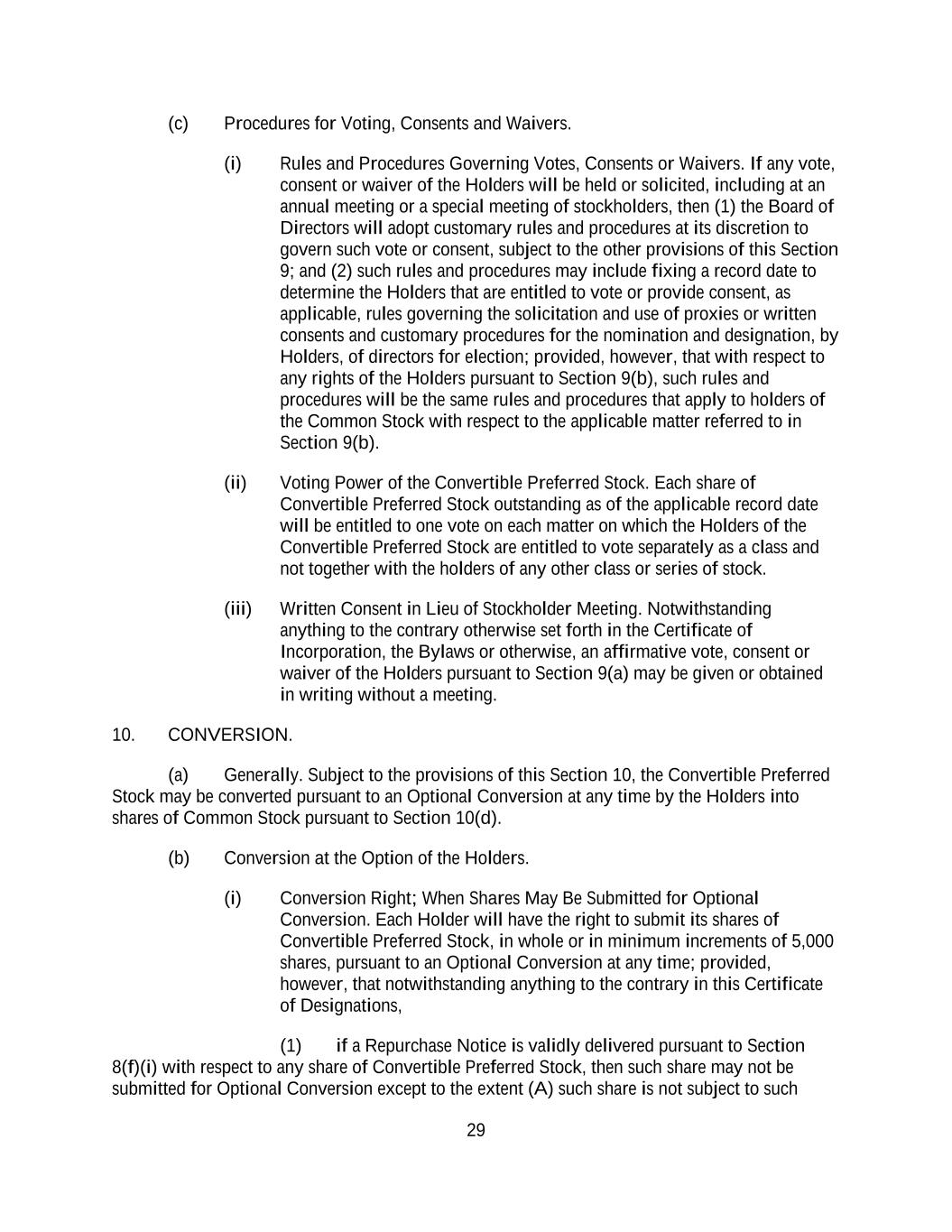 29 (c) Procedures for Voting, Consents and Waivers. (i) Rules and Procedures Governing Votes, Consents or Waivers. If any vote, consent or waiver of the Holders will be held or solicited, including at an annual meeting or a special meeting of stockholders, then (1) the Board of Directors will adopt customary rules and procedures at its discretion to govern such vote or consent, subject to the other provisions of this Section 9; and (2) such rules and procedures may include fixing a record date to determine the Holders that are entitled to vote or provide consent, as applicable, rules governing the solicitation and use of proxies or written consents and customary procedures for the nomination and designation, by Holders, of directors for election; provided, however, that with respect to any rights of the Holders pursuant to Section 9(b), such rules and procedures will be the same rules and procedures that apply to holders of the Common Stock with respect to the applicable matter referred to in Section 9(b). (ii) Voting Power of the Convertible Preferred Stock. Each share of Convertible Preferred Stock outstanding as of the applicable record date will be entitled to one vote on each matter on which the Holders of the Convertible Preferred Stock are entitled to vote separately as a class and not together with the holders of any other class or series of stock. (iii) Written Consent in Lieu of Stockholder Meeting. Notwithstanding anything to the contrary otherwise set forth in the Certificate of Incorporation, the Bylaws or otherwise, an affirmative vote, consent or waiver of the Holders pursuant to Section 9(a) may be given or obtained in writing without a meeting. 10. CONVERSION. (a) Generally. Subject to the provisions of this Section 10, the Convertible Preferred Stock may be converted pursuant to an Optional Conversion at any time by the Holders into shares of Common Stock pursuant to Section 10(d). (b) Conversion at the Option of the Holders. (i) Conversion Right; When Shares May Be Submitted for Optional Conversion. Each Holder will have the right to submit its shares of Convertible Preferred Stock, in whole or in minimum increments of 5,000 shares, pursuant to an Optional Conversion at any time; provided, however, that notwithstanding anything to the contrary in this Certificate of Designations, (1) if a Repurchase Notice is validly delivered pursuant to Section 8(f)(i) with respect to any share of Convertible Preferred Stock, then such share may not be submitted for Optional Conversion except to the extent (A) such share is not subject to such