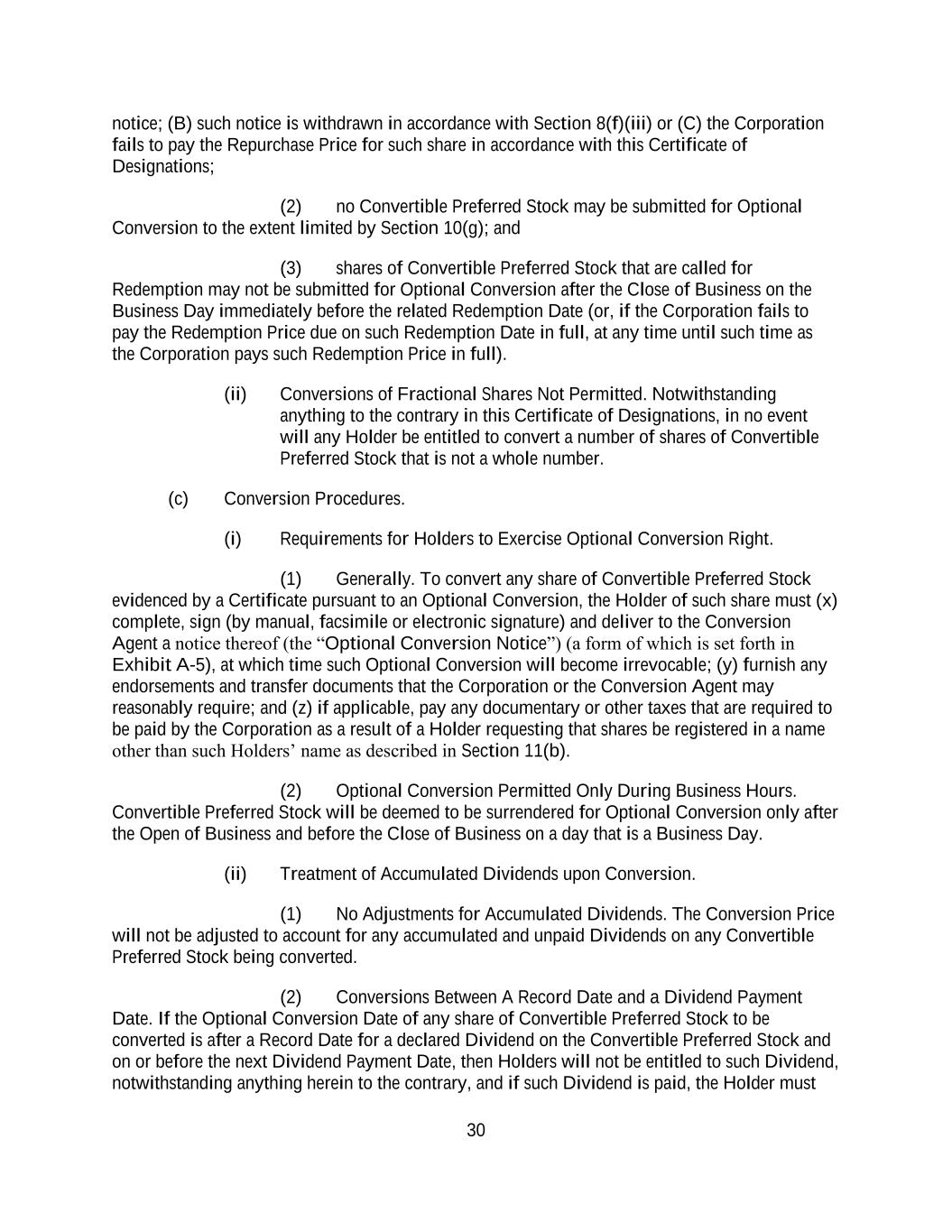 30 notice; (B) such notice is withdrawn in accordance with Section 8(f)(iii) or (C) the Corporation fails to pay the Repurchase Price for such share in accordance with this Certificate of Designations; (2) no Convertible Preferred Stock may be submitted for Optional Conversion to the extent limited by Section 10(g); and (3) shares of Convertible Preferred Stock that are called for Redemption may not be submitted for Optional Conversion after the Close of Business on the Business Day immediately before the related Redemption Date (or, if the Corporation fails to pay the Redemption Price due on such Redemption Date in full, at any time until such time as the Corporation pays such Redemption Price in full). (ii) Conversions of Fractional Shares Not Permitted. Notwithstanding anything to the contrary in this Certificate of Designations, in no event will any Holder be entitled to convert a number of shares of Convertible Preferred Stock that is not a whole number. (c) Conversion Procedures. (i) Requirements for Holders to Exercise Optional Conversion Right. (1) Generally. To convert any share of Convertible Preferred Stock evidenced by a Certificate pursuant to an Optional Conversion, the Holder of such share must (x) complete, sign (by manual, facsimile or electronic signature) and deliver to the Conversion Agent a notice thereof (the “Optional Conversion Notice”) (a form of which is set forth in Exhibit A-5), at which time such Optional Conversion will become irrevocable; (y) furnish any endorsements and transfer documents that the Corporation or the Conversion Agent may reasonably require; and (z) if applicable, pay any documentary or other taxes that are required to be paid by the Corporation as a result of a Holder requesting that shares be registered in a name other than such Holders’ name as described in Section 11(b). (2) Optional Conversion Permitted Only During Business Hours. Convertible Preferred Stock will be deemed to be surrendered for Optional Conversion only after the Open of Business and before the Close of Business on a day that is a Business Day. (ii) Treatment of Accumulated Dividends upon Conversion. (1) No Adjustments for Accumulated Dividends. The Conversion Price will not be adjusted to account for any accumulated and unpaid Dividends on any Convertible Preferred Stock being converted. (2) Conversions Between A Record Date and a Dividend Payment Date. If the Optional Conversion Date of any share of Convertible Preferred Stock to be converted is after a Record Date for a declared Dividend on the Convertible Preferred Stock and on or before the next Dividend Payment Date, then Holders will not be entitled to such Dividend, notwithstanding anything herein to the contrary, and if such Dividend is paid, the Holder must