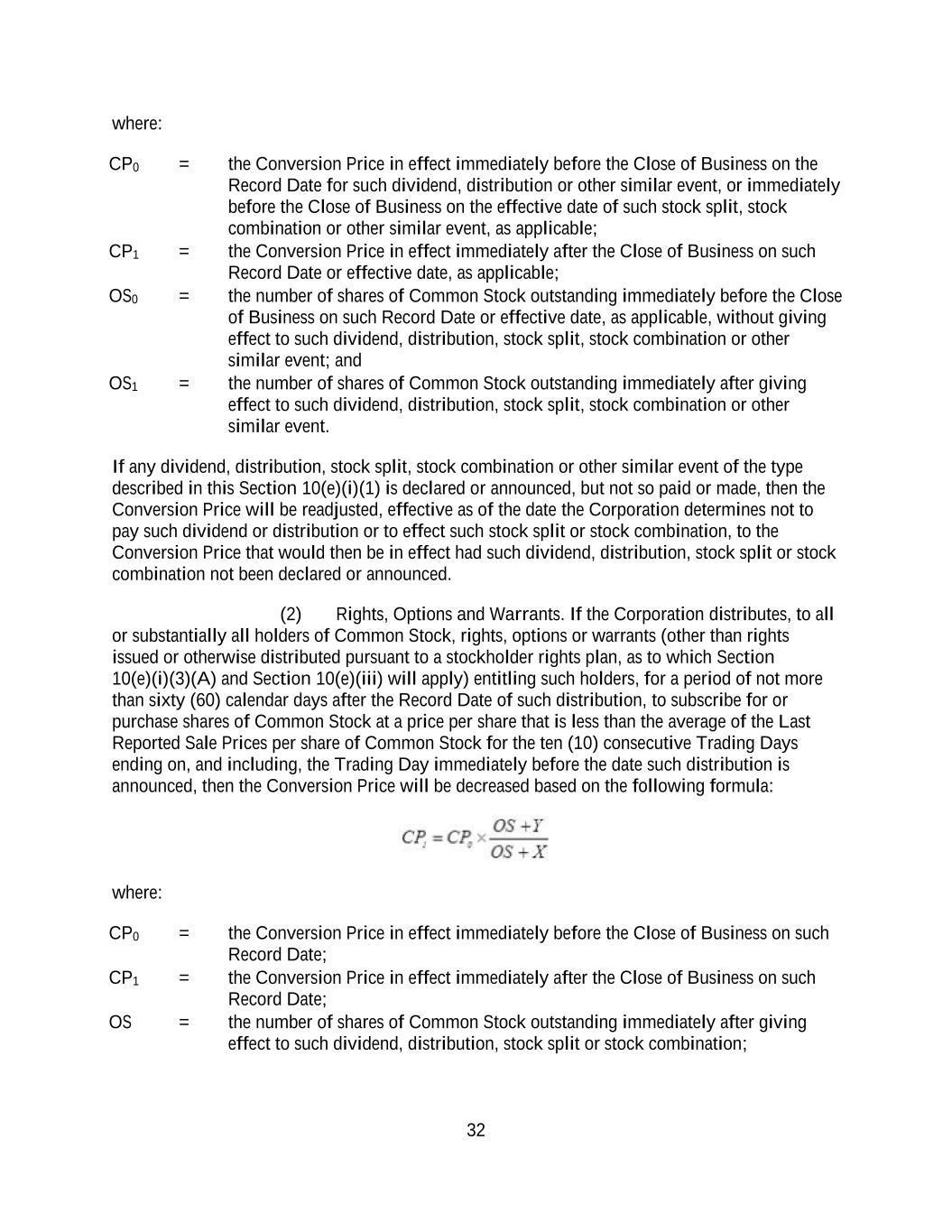 32 where: CP0 = the Conversion Price in effect immediately before the Close of Business on the Record Date for such dividend, distribution or other similar event, or immediately before the Close of Business on the effective date of such stock split, stock combination or other similar event, as applicable; CP1 = the Conversion Price in effect immediately after the Close of Business on such Record Date or effective date, as applicable; OS0 = the number of shares of Common Stock outstanding immediately before the Close of Business on such Record Date or effective date, as applicable, without giving effect to such dividend, distribution, stock split, stock combination or other similar event; and OS1 = the number of shares of Common Stock outstanding immediately after giving effect to such dividend, distribution, stock split, stock combination or other similar event. If any dividend, distribution, stock split, stock combination or other similar event of the type described in this Section 10(e)(i)(1) is declared or announced, but not so paid or made, then the Conversion Price will be readjusted, effective as of the date the Corporation determines not to pay such dividend or distribution or to effect such stock split or stock combination, to the Conversion Price that would then be in effect had such dividend, distribution, stock split or stock combination not been declared or announced. (2) Rights, Options and Warrants. If the Corporation distributes, to all or substantially all holders of Common Stock, rights, options or warrants (other than rights issued or otherwise distributed pursuant to a stockholder rights plan, as to which Section 10(e)(i)(3)(A) and Section 10(e)(iii) will apply) entitling such holders, for a period of not more than sixty (60) calendar days after the Record Date of such distribution, to subscribe for or purchase shares of Common Stock at a price per share that is less than the average of the Last Reported Sale Prices per share of Common Stock for the ten (10) consecutive Trading Days ending on, and including, the Trading Day immediately before the date such distribution is announced, then the Conversion Price will be decreased based on the following formula: where: CP0 = the Conversion Price in effect immediately before the Close of Business on such Record Date; CP1 = the Conversion Price in effect immediately after the Close of Business on such Record Date; OS = the number of shares of Common Stock outstanding immediately after giving effect to such dividend, distribution, stock split or stock combination;