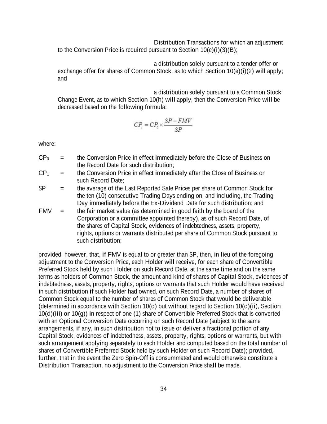 34 Distribution Transactions for which an adjustment to the Conversion Price is required pursuant to Section 10(e)(i)(3)(B); a distribution solely pursuant to a tender offer or exchange offer for shares of Common Stock, as to which Section 10(e)(i)(2) will apply; and a distribution solely pursuant to a Common Stock Change Event, as to which Section 10(h) will apply, then the Conversion Price will be decreased based on the following formula: where: CP0 = the Conversion Price in effect immediately before the Close of Business on the Record Date for such distribution; CP1 = the Conversion Price in effect immediately after the Close of Business on such Record Date; SP = the average of the Last Reported Sale Prices per share of Common Stock for the ten (10) consecutive Trading Days ending on, and including, the Trading Day immediately before the Ex-Dividend Date for such distribution; and FMV = the fair market value (as determined in good faith by the board of the Corporation or a committee appointed thereby), as of such Record Date, of the shares of Capital Stock, evidences of indebtedness, assets, property, rights, options or warrants distributed per share of Common Stock pursuant to such distribution; provided, however, that, if FMV is equal to or greater than SP, then, in lieu of the foregoing adjustment to the Conversion Price, each Holder will receive, for each share of Convertible Preferred Stock held by such Holder on such Record Date, at the same time and on the same terms as holders of Common Stock, the amount and kind of shares of Capital Stock, evidences of indebtedness, assets, property, rights, options or warrants that such Holder would have received in such distribution if such Holder had owned, on such Record Date, a number of shares of Common Stock equal to the number of shares of Common Stock that would be deliverable (determined in accordance with Section 10(d) but without regard to Section 10(d)(ii), Section 10(d)(iii) or 10(g)) in respect of one (1) share of Convertible Preferred Stock that is converted with an Optional Conversion Date occurring on such Record Date (subject to the same arrangements, if any, in such distribution not to issue or deliver a fractional portion of any Capital Stock, evidences of indebtedness, assets, property, rights, options or warrants, but with such arrangement applying separately to each Holder and computed based on the total number of shares of Convertible Preferred Stock held by such Holder on such Record Date); provided, further, that in the event the Zero Spin-Off is consummated and would otherwise constitute a Distribution Transaction, no adjustment to the Conversion Price shall be made.