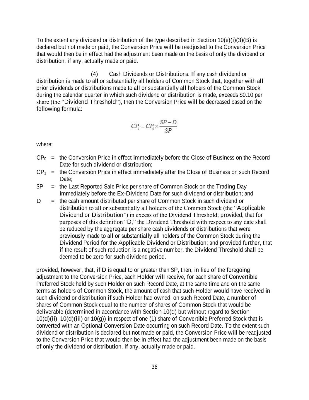 36 To the extent any dividend or distribution of the type described in Section 10(e)(i)(3)(B) is declared but not made or paid, the Conversion Price will be readjusted to the Conversion Price that would then be in effect had the adjustment been made on the basis of only the dividend or distribution, if any, actually made or paid. (4) Cash Dividends or Distributions. If any cash dividend or distribution is made to all or substantially all holders of Common Stock that, together with all prior dividends or distributions made to all or substantially all holders of the Common Stock during the calendar quarter in which such dividend or distribution is made, exceeds $0.10 per share (the “Dividend Threshold”), then the Conversion Price will be decreased based on the following formula: where: CP0 = the Conversion Price in effect immediately before the Close of Business on the Record Date for such dividend or distribution; CP1 = the Conversion Price in effect immediately after the Close of Business on such Record Date; SP = the Last Reported Sale Price per share of Common Stock on the Trading Day immediately before the Ex-Dividend Date for such dividend or distribution; and D = the cash amount distributed per share of Common Stock in such dividend or distribution to all or substantially all holders of the Common Stock (the “Applicable Dividend or Distribution”) in excess of the Dividend Threshold; provided, that for purposes of this definition “D,” the Dividend Threshold with respect to any date shall be reduced by the aggregate per share cash dividends or distributions that were previously made to all or substantially all holders of the Common Stock during the Dividend Period for the Applicable Dividend or Distribution; and provided further, that if the result of such reduction is a negative number, the Dividend Threshold shall be deemed to be zero for such dividend period. provided, however, that, if D is equal to or greater than SP, then, in lieu of the foregoing adjustment to the Conversion Price, each Holder will receive, for each share of Convertible Preferred Stock held by such Holder on such Record Date, at the same time and on the same terms as holders of Common Stock, the amount of cash that such Holder would have received in such dividend or distribution if such Holder had owned, on such Record Date, a number of shares of Common Stock equal to the number of shares of Common Stock that would be deliverable (determined in accordance with Section 10(d) but without regard to Section 10(d)(ii), 10(d)(iii) or 10(g)) in respect of one (1) share of Convertible Preferred Stock that is converted with an Optional Conversion Date occurring on such Record Date. To the extent such dividend or distribution is declared but not made or paid, the Conversion Price will be readjusted to the Conversion Price that would then be in effect had the adjustment been made on the basis of only the dividend or distribution, if any, actually made or paid.