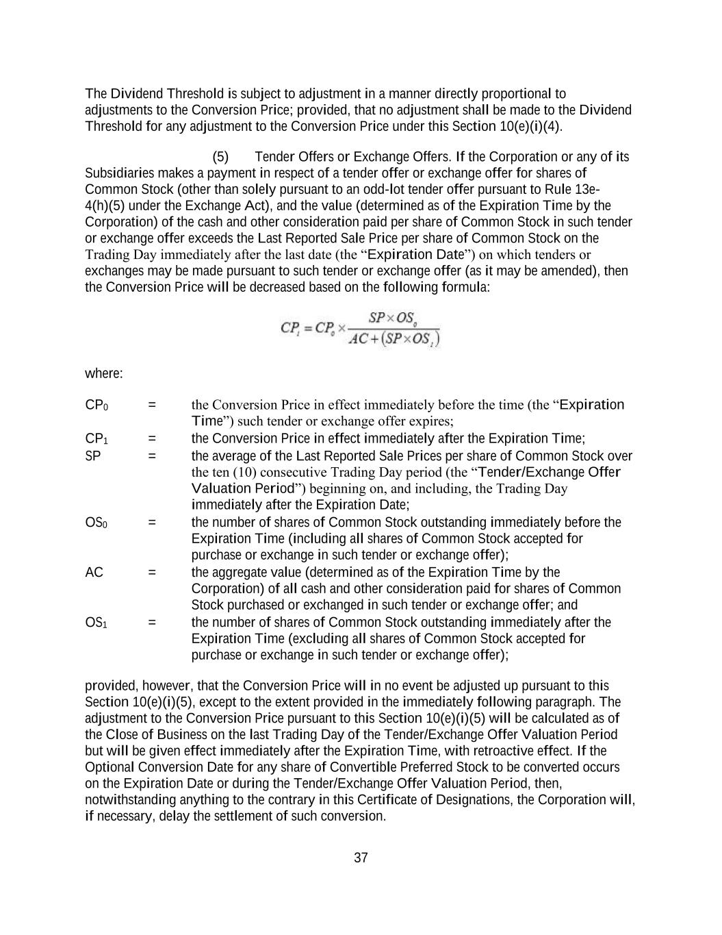 37 The Dividend Threshold is subject to adjustment in a manner directly proportional to adjustments to the Conversion Price; provided, that no adjustment shall be made to the Dividend Threshold for any adjustment to the Conversion Price under this Section 10(e)(i)(4). (5) Tender Offers or Exchange Offers. If the Corporation or any of its Subsidiaries makes a payment in respect of a tender offer or exchange offer for shares of Common Stock (other than solely pursuant to an odd-lot tender offer pursuant to Rule 13e- 4(h)(5) under the Exchange Act), and the value (determined as of the Expiration Time by the Corporation) of the cash and other consideration paid per share of Common Stock in such tender or exchange offer exceeds the Last Reported Sale Price per share of Common Stock on the Trading Day immediately after the last date (the “Expiration Date”) on which tenders or exchanges may be made pursuant to such tender or exchange offer (as it may be amended), then the Conversion Price will be decreased based on the following formula: where: CP0 = the Conversion Price in effect immediately before the time (the “Expiration Time”) such tender or exchange offer expires; CP1 = the Conversion Price in effect immediately after the Expiration Time; SP = the average of the Last Reported Sale Prices per share of Common Stock over the ten (10) consecutive Trading Day period (the “Tender/Exchange Offer Valuation Period”) beginning on, and including, the Trading Day immediately after the Expiration Date; OS0 = the number of shares of Common Stock outstanding immediately before the Expiration Time (including all shares of Common Stock accepted for purchase or exchange in such tender or exchange offer); AC = the aggregate value (determined as of the Expiration Time by the Corporation) of all cash and other consideration paid for shares of Common Stock purchased or exchanged in such tender or exchange offer; and OS1 = the number of shares of Common Stock outstanding immediately after the Expiration Time (excluding all shares of Common Stock accepted for purchase or exchange in such tender or exchange offer); provided, however, that the Conversion Price will in no event be adjusted up pursuant to this Section 10(e)(i)(5), except to the extent provided in the immediately following paragraph. The adjustment to the Conversion Price pursuant to this Section 10(e)(i)(5) will be calculated as of the Close of Business on the last Trading Day of the Tender/Exchange Offer Valuation Period but will be given effect immediately after the Expiration Time, with retroactive effect. If the Optional Conversion Date for any share of Convertible Preferred Stock to be converted occurs on the Expiration Date or during the Tender/Exchange Offer Valuation Period, then, notwithstanding anything to the contrary in this Certificate of Designations, the Corporation will, if necessary, delay the settlement of such conversion.