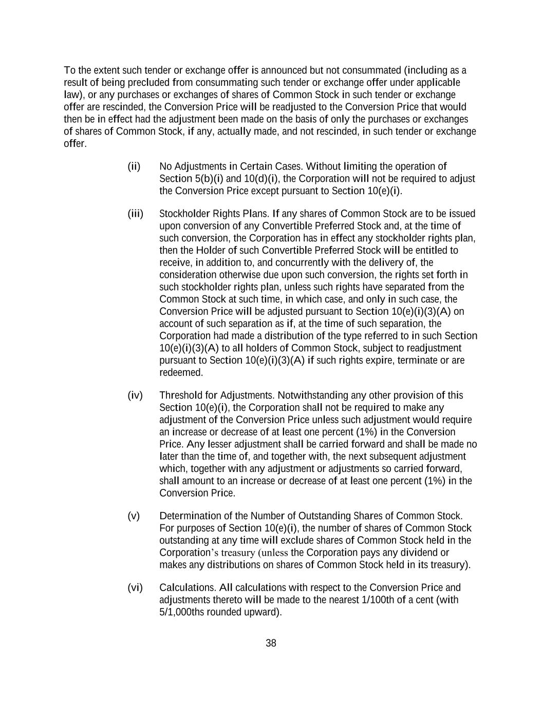38 To the extent such tender or exchange offer is announced but not consummated (including as a result of being precluded from consummating such tender or exchange offer under applicable law), or any purchases or exchanges of shares of Common Stock in such tender or exchange offer are rescinded, the Conversion Price will be readjusted to the Conversion Price that would then be in effect had the adjustment been made on the basis of only the purchases or exchanges of shares of Common Stock, if any, actually made, and not rescinded, in such tender or exchange offer. (ii) No Adjustments in Certain Cases. Without limiting the operation of Section 5(b)(i) and 10(d)(i), the Corporation will not be required to adjust the Conversion Price except pursuant to Section 10(e)(i). (iii) Stockholder Rights Plans. If any shares of Common Stock are to be issued upon conversion of any Convertible Preferred Stock and, at the time of such conversion, the Corporation has in effect any stockholder rights plan, then the Holder of such Convertible Preferred Stock will be entitled to receive, in addition to, and concurrently with the delivery of, the consideration otherwise due upon such conversion, the rights set forth in such stockholder rights plan, unless such rights have separated from the Common Stock at such time, in which case, and only in such case, the Conversion Price will be adjusted pursuant to Section 10(e)(i)(3)(A) on account of such separation as if, at the time of such separation, the Corporation had made a distribution of the type referred to in such Section 10(e)(i)(3)(A) to all holders of Common Stock, subject to readjustment pursuant to Section 10(e)(i)(3)(A) if such rights expire, terminate or are redeemed. (iv) Threshold for Adjustments. Notwithstanding any other provision of this Section 10(e)(i), the Corporation shall not be required to make any adjustment of the Conversion Price unless such adjustment would require an increase or decrease of at least one percent (1%) in the Conversion Price. Any lesser adjustment shall be carried forward and shall be made no later than the time of, and together with, the next subsequent adjustment which, together with any adjustment or adjustments so carried forward, shall amount to an increase or decrease of at least one percent (1%) in the Conversion Price. (v) Determination of the Number of Outstanding Shares of Common Stock. For purposes of Section 10(e)(i), the number of shares of Common Stock outstanding at any time will exclude shares of Common Stock held in the Corporation’s treasury (unless the Corporation pays any dividend or makes any distributions on shares of Common Stock held in its treasury). (vi) Calculations. All calculations with respect to the Conversion Price and adjustments thereto will be made to the nearest 1/100th of a cent (with 5/1,000ths rounded upward).