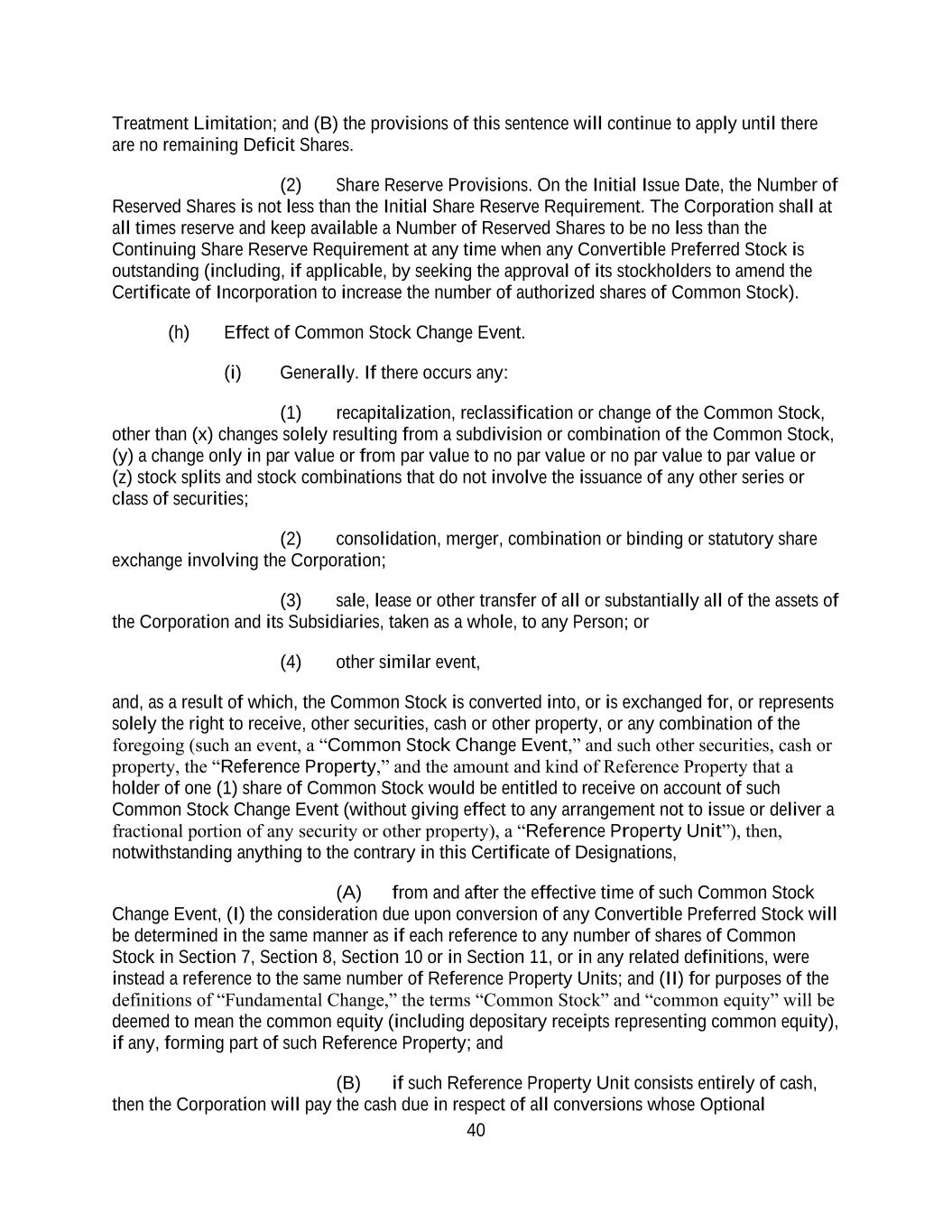 40 Treatment Limitation; and (B) the provisions of this sentence will continue to apply until there are no remaining Deficit Shares. (2) Share Reserve Provisions. On the Initial Issue Date, the Number of Reserved Shares is not less than the Initial Share Reserve Requirement. The Corporation shall at all times reserve and keep available a Number of Reserved Shares to be no less than the Continuing Share Reserve Requirement at any time when any Convertible Preferred Stock is outstanding (including, if applicable, by seeking the approval of its stockholders to amend the Certificate of Incorporation to increase the number of authorized shares of Common Stock). (h) Effect of Common Stock Change Event. (i) Generally. If there occurs any: (1) recapitalization, reclassification or change of the Common Stock, other than (x) changes solely resulting from a subdivision or combination of the Common Stock, (y) a change only in par value or from par value to no par value or no par value to par value or (z) stock splits and stock combinations that do not involve the issuance of any other series or class of securities; (2) consolidation, merger, combination or binding or statutory share exchange involving the Corporation; (3) sale, lease or other transfer of all or substantially all of the assets of the Corporation and its Subsidiaries, taken as a whole, to any Person; or (4) other similar event, and, as a result of which, the Common Stock is converted into, or is exchanged for, or represents solely the right to receive, other securities, cash or other property, or any combination of the foregoing (such an event, a “Common Stock Change Event,” and such other securities, cash or property, the “Reference Property,” and the amount and kind of Reference Property that a holder of one (1) share of Common Stock would be entitled to receive on account of such Common Stock Change Event (without giving effect to any arrangement not to issue or deliver a fractional portion of any security or other property), a “Reference Property Unit”), then, notwithstanding anything to the contrary in this Certificate of Designations, (A) from and after the effective time of such Common Stock Change Event, (I) the consideration due upon conversion of any Convertible Preferred Stock will be determined in the same manner as if each reference to any number of shares of Common Stock in Section 7, Section 8, Section 10 or in Section 11, or in any related definitions, were instead a reference to the same number of Reference Property Units; and (II) for purposes of the definitions of “Fundamental Change,” the terms “Common Stock” and “common equity” will be deemed to mean the common equity (including depositary receipts representing common equity), if any, forming part of such Reference Property; and (B) if such Reference Property Unit consists entirely of cash, then the Corporation will pay the cash due in respect of all conversions whose Optional