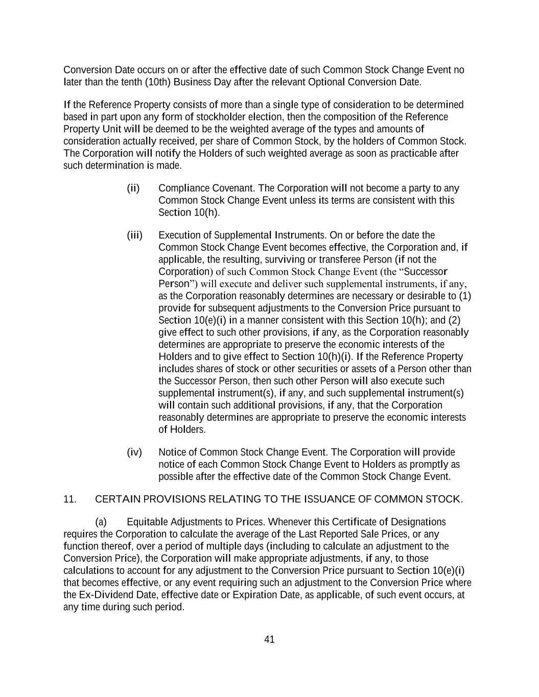 41 Conversion Date occurs on or after the effective date of such Common Stock Change Event no later than the tenth (10th) Business Day after the relevant Optional Conversion Date. If the Reference Property consists of more than a single type of consideration to be determined based in part upon any form of stockholder election, then the composition of the Reference Property Unit will be deemed to be the weighted average of the types and amounts of consideration actually received, per share of Common Stock, by the holders of Common Stock. The Corporation will notify the Holders of such weighted average as soon as practicable after such determination is made. (ii) Compliance Covenant. The Corporation will not become a party to any Common Stock Change Event unless its terms are consistent with this Section 10(h). (iii) Execution of Supplemental Instruments. On or before the date the Common Stock Change Event becomes effective, the Corporation and, if applicable, the resulting, surviving or transferee Person (if not the Corporation) of such Common Stock Change Event (the “Successor Person”) will execute and deliver such supplemental instruments, if any, as the Corporation reasonably determines are necessary or desirable to (1) provide for subsequent adjustments to the Conversion Price pursuant to Section 10(e)(i) in a manner consistent with this Section 10(h); and (2) give effect to such other provisions, if any, as the Corporation reasonably determines are appropriate to preserve the economic interests of the Holders and to give effect to Section 10(h)(i). If the Reference Property includes shares of stock or other securities or assets of a Person other than the Successor Person, then such other Person will also execute such supplemental instrument(s), if any, and such supplemental instrument(s) will contain such additional provisions, if any, that the Corporation reasonably determines are appropriate to preserve the economic interests of Holders. (iv) Notice of Common Stock Change Event. The Corporation will provide notice of each Common Stock Change Event to Holders as promptly as possible after the effective date of the Common Stock Change Event. 11. CERTAIN PROVISIONS RELATING TO THE ISSUANCE OF COMMON STOCK. (a) Equitable Adjustments to Prices. Whenever this Certificate of Designations requires the Corporation to calculate the average of the Last Reported Sale Prices, or any function thereof, over a period of multiple days (including to calculate an adjustment to the Conversion Price), the Corporation will make appropriate adjustments, if any, to those calculations to account for any adjustment to the Conversion Price pursuant to Section 10(e)(i) that becomes effective, or any event requiring such an adjustment to the Conversion Price where the Ex-Dividend Date, effective date or Expiration Date, as applicable, of such event occurs, at any time during such period.