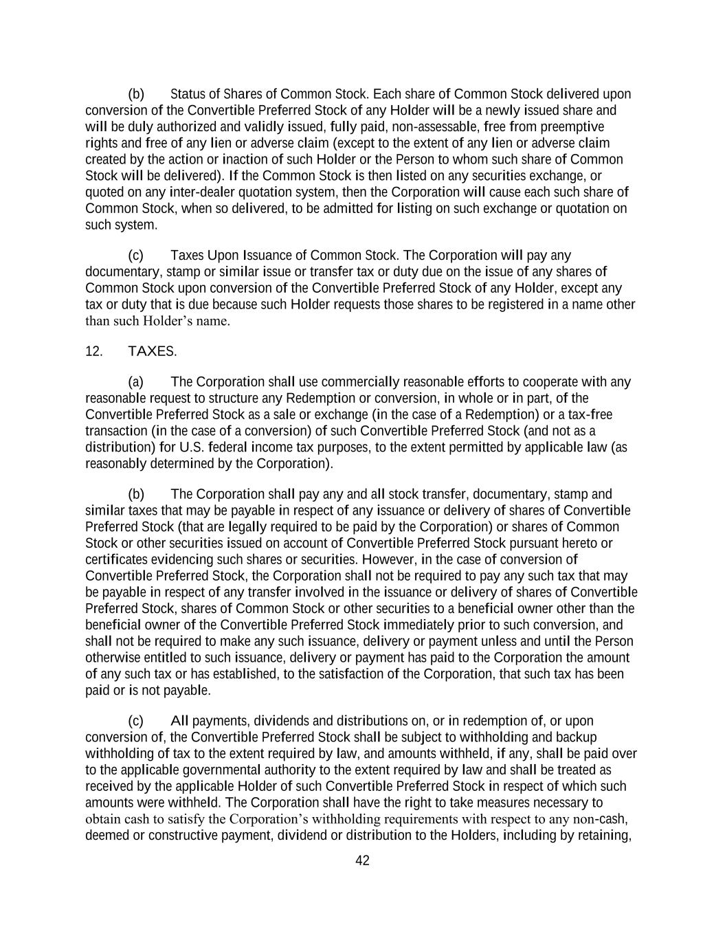 42 (b) Status of Shares of Common Stock. Each share of Common Stock delivered upon conversion of the Convertible Preferred Stock of any Holder will be a newly issued share and will be duly authorized and validly issued, fully paid, non-assessable, free from preemptive rights and free of any lien or adverse claim (except to the extent of any lien or adverse claim created by the action or inaction of such Holder or the Person to whom such share of Common Stock will be delivered). If the Common Stock is then listed on any securities exchange, or quoted on any inter-dealer quotation system, then the Corporation will cause each such share of Common Stock, when so delivered, to be admitted for listing on such exchange or quotation on such system. (c) Taxes Upon Issuance of Common Stock. The Corporation will pay any documentary, stamp or similar issue or transfer tax or duty due on the issue of any shares of Common Stock upon conversion of the Convertible Preferred Stock of any Holder, except any tax or duty that is due because such Holder requests those shares to be registered in a name other than such Holder’s name. 12. TAXES. (a) The Corporation shall use commercially reasonable efforts to cooperate with any reasonable request to structure any Redemption or conversion, in whole or in part, of the Convertible Preferred Stock as a sale or exchange (in the case of a Redemption) or a tax-free transaction (in the case of a conversion) of such Convertible Preferred Stock (and not as a distribution) for U.S. federal income tax purposes, to the extent permitted by applicable law (as reasonably determined by the Corporation). (b) The Corporation shall pay any and all stock transfer, documentary, stamp and similar taxes that may be payable in respect of any issuance or delivery of shares of Convertible Preferred Stock (that are legally required to be paid by the Corporation) or shares of Common Stock or other securities issued on account of Convertible Preferred Stock pursuant hereto or certificates evidencing such shares or securities. However, in the case of conversion of Convertible Preferred Stock, the Corporation shall not be required to pay any such tax that may be payable in respect of any transfer involved in the issuance or delivery of shares of Convertible Preferred Stock, shares of Common Stock or other securities to a beneficial owner other than the beneficial owner of the Convertible Preferred Stock immediately prior to such conversion, and shall not be required to make any such issuance, delivery or payment unless and until the Person otherwise entitled to such issuance, delivery or payment has paid to the Corporation the amount of any such tax or has established, to the satisfaction of the Corporation, that such tax has been paid or is not payable. (c) All payments, dividends and distributions on, or in redemption of, or upon conversion of, the Convertible Preferred Stock shall be subject to withholding and backup withholding of tax to the extent required by law, and amounts withheld, if any, shall be paid over to the applicable governmental authority to the extent required by law and shall be treated as received by the applicable Holder of such Convertible Preferred Stock in respect of which such amounts were withheld. The Corporation shall have the right to take measures necessary to obtain cash to satisfy the Corporation’s withholding requirements with respect to any non-cash, deemed or constructive payment, dividend or distribution to the Holders, including by retaining,