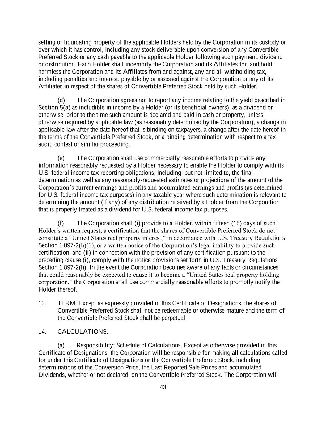 43 selling or liquidating property of the applicable Holders held by the Corporation in its custody or over which it has control, including any stock deliverable upon conversion of any Convertible Preferred Stock or any cash payable to the applicable Holder following such payment, dividend or distribution. Each Holder shall indemnify the Corporation and its Affiliates for, and hold harmless the Corporation and its Affiliates from and against, any and all withholding tax, including penalties and interest, payable by or assessed against the Corporation or any of its Affiliates in respect of the shares of Convertible Preferred Stock held by such Holder. (d) The Corporation agrees not to report any income relating to the yield described in Section 5(a) as includible in income by a Holder (or its beneficial owners), as a dividend or otherwise, prior to the time such amount is declared and paid in cash or property, unless otherwise required by applicable law (as reasonably determined by the Corporation), a change in applicable law after the date hereof that is binding on taxpayers, a change after the date hereof in the terms of the Convertible Preferred Stock, or a binding determination with respect to a tax audit, contest or similar proceeding. (e) The Corporation shall use commercially reasonable efforts to provide any information reasonably requested by a Holder necessary to enable the Holder to comply with its U.S. federal income tax reporting obligations, including, but not limited to, the final determination as well as any reasonably-requested estimates or projections of the amount of the Corporation’s current earnings and profits and accumulated earnings and profits (as determined for U.S. federal income tax purposes) in any taxable year where such determination is relevant to determining the amount (if any) of any distribution received by a Holder from the Corporation that is properly treated as a dividend for U.S. federal income tax purposes. (f) The Corporation shall (i) provide to a Holder, within fifteen (15) days of such Holder’s written request, a certification that the shares of Convertible Preferred Stock do not constitute a “United States real property interest,” in accordance with U.S. Treasury Regulations Section 1.897-2(h)(1), or a written notice of the Corporation’s legal inability to provide such certification, and (ii) in connection with the provision of any certification pursuant to the preceding clause (i), comply with the notice provisions set forth in U.S. Treasury Regulations Section 1.897-2(h). In the event the Corporation becomes aware of any facts or circumstances that could reasonably be expected to cause it to become a “United States real property holding corporation,” the Corporation shall use commercially reasonable efforts to promptly notify the Holder thereof. 13. TERM. Except as expressly provided in this Certificate of Designations, the shares of Convertible Preferred Stock shall not be redeemable or otherwise mature and the term of the Convertible Preferred Stock shall be perpetual. 14. CALCULATIONS. (a) Responsibility; Schedule of Calculations. Except as otherwise provided in this Certificate of Designations, the Corporation will be responsible for making all calculations called for under this Certificate of Designations or the Convertible Preferred Stock, including determinations of the Conversion Price, the Last Reported Sale Prices and accumulated Dividends, whether or not declared, on the Convertible Preferred Stock. The Corporation will