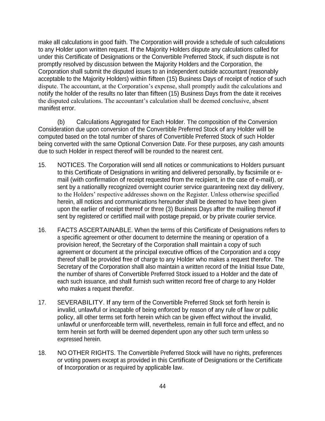 44 make all calculations in good faith. The Corporation will provide a schedule of such calculations to any Holder upon written request. If the Majority Holders dispute any calculations called for under this Certificate of Designations or the Convertible Preferred Stock, if such dispute is not promptly resolved by discussion between the Majority Holders and the Corporation, the Corporation shall submit the disputed issues to an independent outside accountant (reasonably acceptable to the Majority Holders) within fifteen (15) Business Days of receipt of notice of such dispute. The accountant, at the Corporation’s expense, shall promptly audit the calculations and notify the holder of the results no later than fifteen (15) Business Days from the date it receives the disputed calculations. The accountant’s calculation shall be deemed conclusive, absent manifest error. (b) Calculations Aggregated for Each Holder. The composition of the Conversion Consideration due upon conversion of the Convertible Preferred Stock of any Holder will be computed based on the total number of shares of Convertible Preferred Stock of such Holder being converted with the same Optional Conversion Date. For these purposes, any cash amounts due to such Holder in respect thereof will be rounded to the nearest cent. 15. NOTICES. The Corporation will send all notices or communications to Holders pursuant to this Certificate of Designations in writing and delivered personally, by facsimile or e- mail (with confirmation of receipt requested from the recipient, in the case of e-mail), or sent by a nationally recognized overnight courier service guaranteeing next day delivery, to the Holders’ respective addresses shown on the Register. Unless otherwise specified herein, all notices and communications hereunder shall be deemed to have been given upon the earlier of receipt thereof or three (3) Business Days after the mailing thereof if sent by registered or certified mail with postage prepaid, or by private courier service. 16. FACTS ASCERTAINABLE. When the terms of this Certificate of Designations refers to a specific agreement or other document to determine the meaning or operation of a provision hereof, the Secretary of the Corporation shall maintain a copy of such agreement or document at the principal executive offices of the Corporation and a copy thereof shall be provided free of charge to any Holder who makes a request therefor. The Secretary of the Corporation shall also maintain a written record of the Initial Issue Date, the number of shares of Convertible Preferred Stock issued to a Holder and the date of each such issuance, and shall furnish such written record free of charge to any Holder who makes a request therefor. 17. SEVERABILITY. If any term of the Convertible Preferred Stock set forth herein is invalid, unlawful or incapable of being enforced by reason of any rule of law or public policy, all other terms set forth herein which can be given effect without the invalid, unlawful or unenforceable term will, nevertheless, remain in full force and effect, and no term herein set forth will be deemed dependent upon any other such term unless so expressed herein. 18. NO OTHER RIGHTS. The Convertible Preferred Stock will have no rights, preferences or voting powers except as provided in this Certificate of Designations or the Certificate of Incorporation or as required by applicable law.