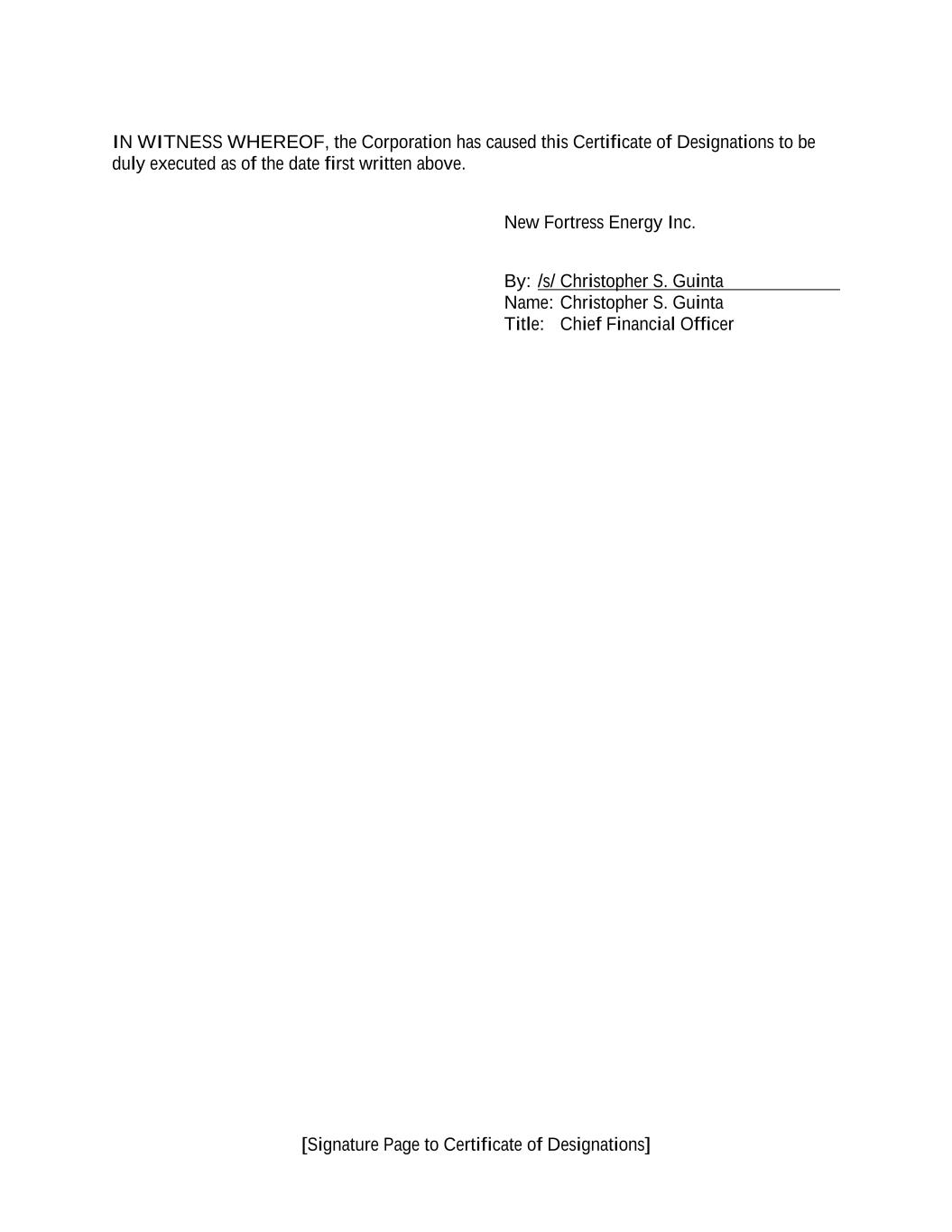 [Signature Page to Certificate of Designations] IN WITNESS WHEREOF, the Corporation has caused this Certificate of Designations to be duly executed as of the date first written above. New Fortress Energy Inc. By: /s/ Christopher S. Guinta Name: Christopher S. Guinta Title: Chief Financial Officer