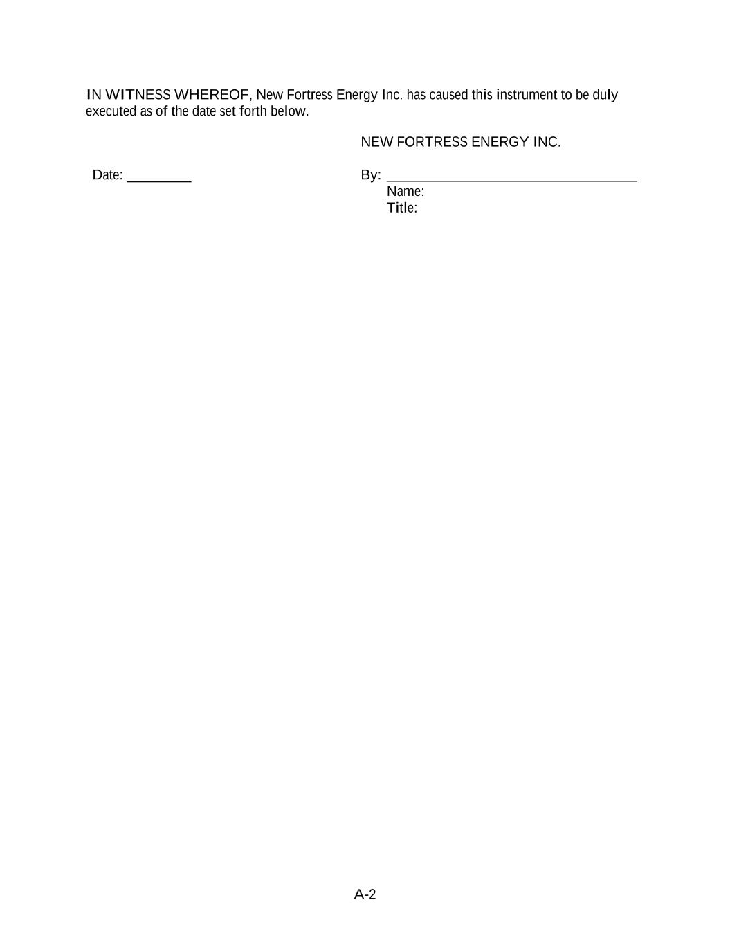 A-2 IN WITNESS WHEREOF, New Fortress Energy Inc. has caused this instrument to be duly executed as of the date set forth below. NEW FORTRESS ENERGY INC. Date: _________ By: Name: Title: