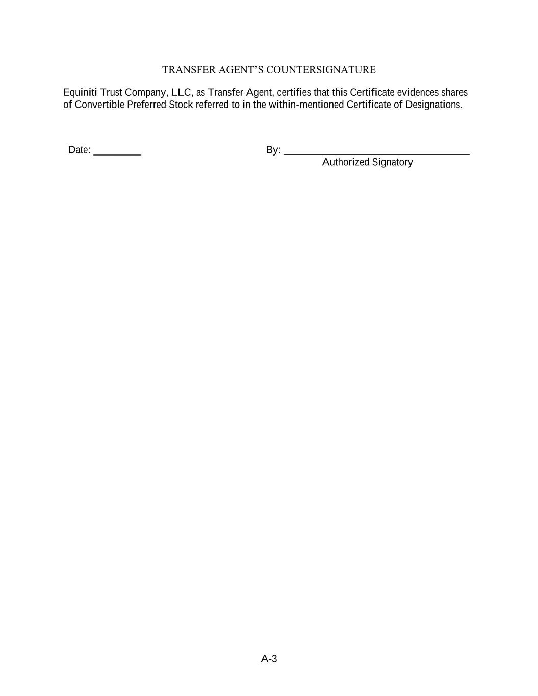 A-3 TRANSFER AGENT’S COUNTERSIGNATURE Equiniti Trust Company, LLC, as Transfer Agent, certifies that this Certificate evidences shares of Convertible Preferred Stock referred to in the within-mentioned Certificate of Designations. Date: _________ By: Authorized Signatory