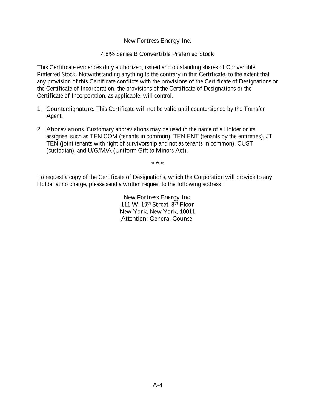 A-4 New Fortress Energy Inc. 4.8% Series B Convertible Preferred Stock This Certificate evidences duly authorized, issued and outstanding shares of Convertible Preferred Stock. Notwithstanding anything to the contrary in this Certificate, to the extent that any provision of this Certificate conflicts with the provisions of the Certificate of Designations or the Certificate of Incorporation, the provisions of the Certificate of Designations or the Certificate of Incorporation, as applicable, will control. 1. Countersignature. This Certificate will not be valid until countersigned by the Transfer Agent. 2. Abbreviations. Customary abbreviations may be used in the name of a Holder or its assignee, such as TEN COM (tenants in common), TEN ENT (tenants by the entireties), JT TEN (joint tenants with right of survivorship and not as tenants in common), CUST (custodian), and U/G/M/A (Uniform Gift to Minors Act). * * * To request a copy of the Certificate of Designations, which the Corporation will provide to any Holder at no charge, please send a written request to the following address: New Fortress Energy Inc. 111 W. 19th Street, 8th Floor New York, New York, 10011 Attention: General Counsel