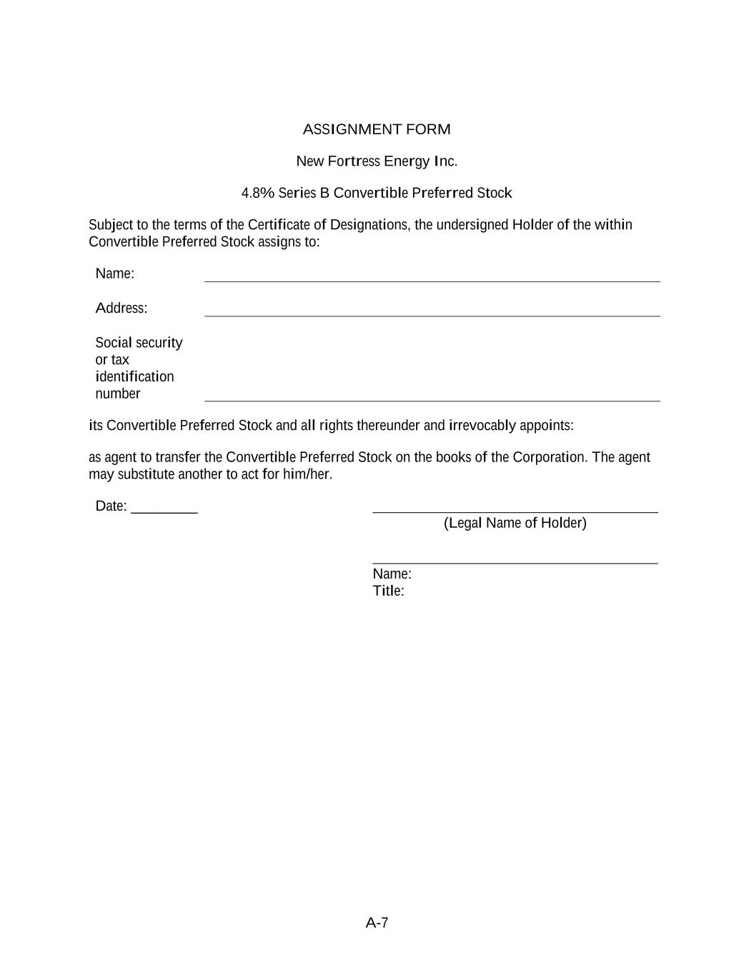 A-7 ASSIGNMENT FORM New Fortress Energy Inc. 4.8% Series B Convertible Preferred Stock Subject to the terms of the Certificate of Designations, the undersigned Holder of the within Convertible Preferred Stock assigns to: Name: Address: Social security or tax identification number its Convertible Preferred Stock and all rights thereunder and irrevocably appoints: as agent to transfer the Convertible Preferred Stock on the books of the Corporation. The agent may substitute another to act for him/her. Date: _________ (Legal Name of Holder) Name: Title: