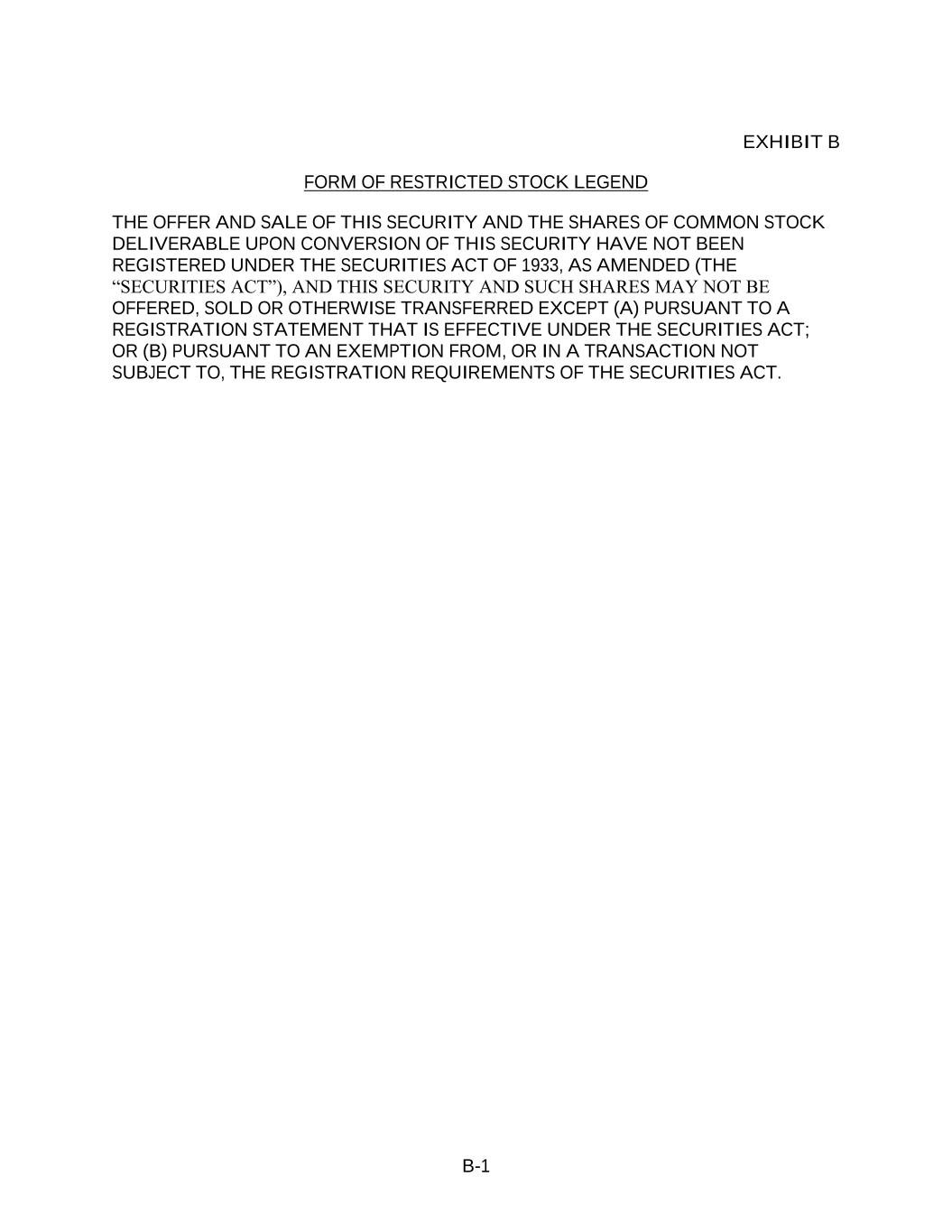 B-1 EXHIBIT B FORM OF RESTRICTED STOCK LEGEND THE OFFER AND SALE OF THIS SECURITY AND THE SHARES OF COMMON STOCK DELIVERABLE UPON CONVERSION OF THIS SECURITY HAVE NOT BEEN REGISTERED UNDER THE SECURITIES ACT OF 1933, AS AMENDED (THE “SECURITIES ACT”), AND THIS SECURITY AND SUCH SHARES MAY NOT BE OFFERED, SOLD OR OTHERWISE TRANSFERRED EXCEPT (A) PURSUANT TO A REGISTRATION STATEMENT THAT IS EFFECTIVE UNDER THE SECURITIES ACT; OR (B) PURSUANT TO AN EXEMPTION FROM, OR IN A TRANSACTION NOT SUBJECT TO, THE REGISTRATION REQUIREMENTS OF THE SECURITIES ACT.